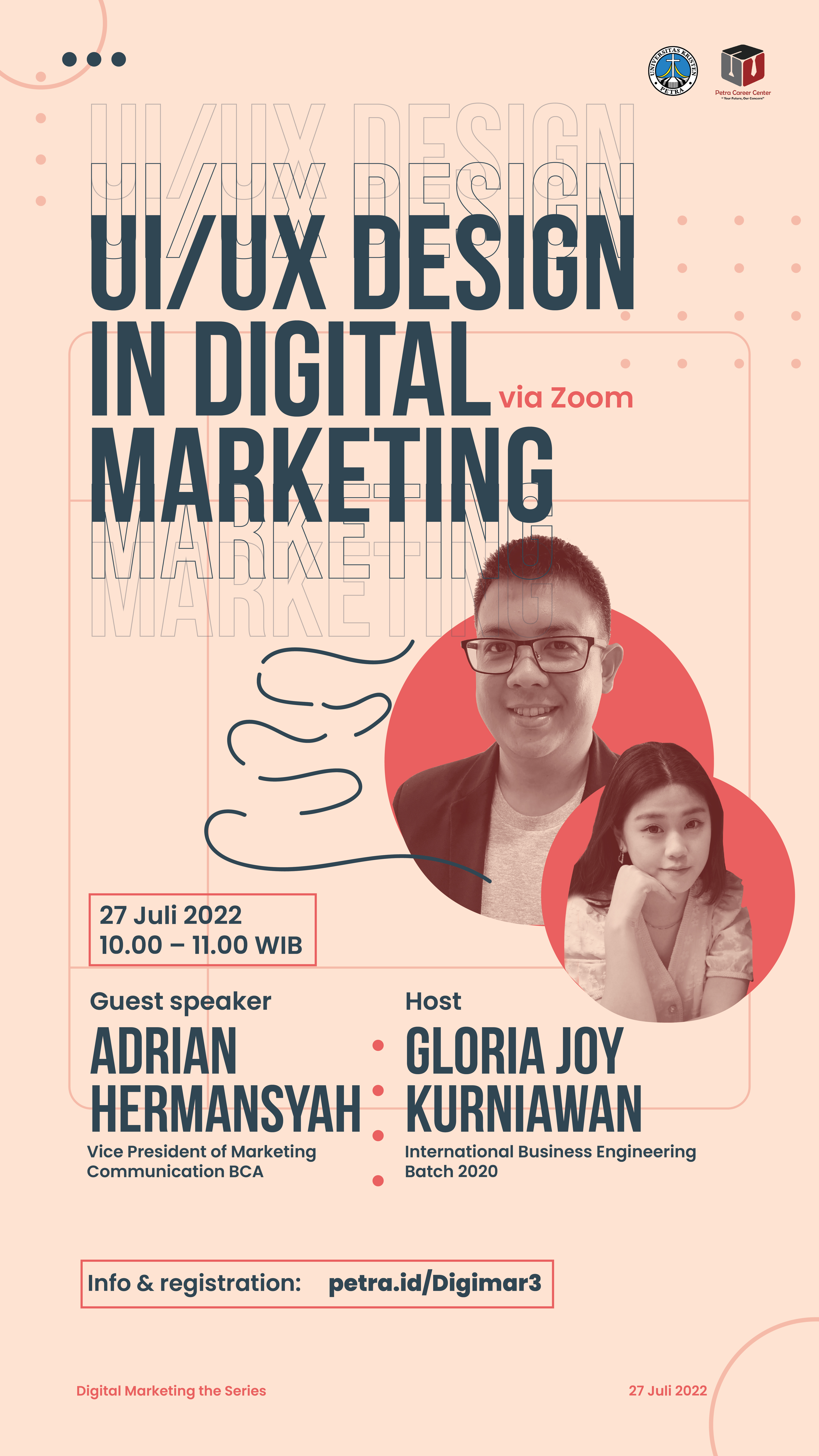 Masih dalam lanjutan digital marketing the series melalui webinar ini peserta memahami dan mengerti pentingnya UI dan UX dari sebuah platform yang diggunakan, sehingga dan bagaimana UI dan UX bisa membentuk sense of belonging dari target market. Acara ini digelar pada 27 Juli 2022 jam 10.00 - 11.00 WIB. Dengan narasumber Adrian Hermansyah dari BCA.