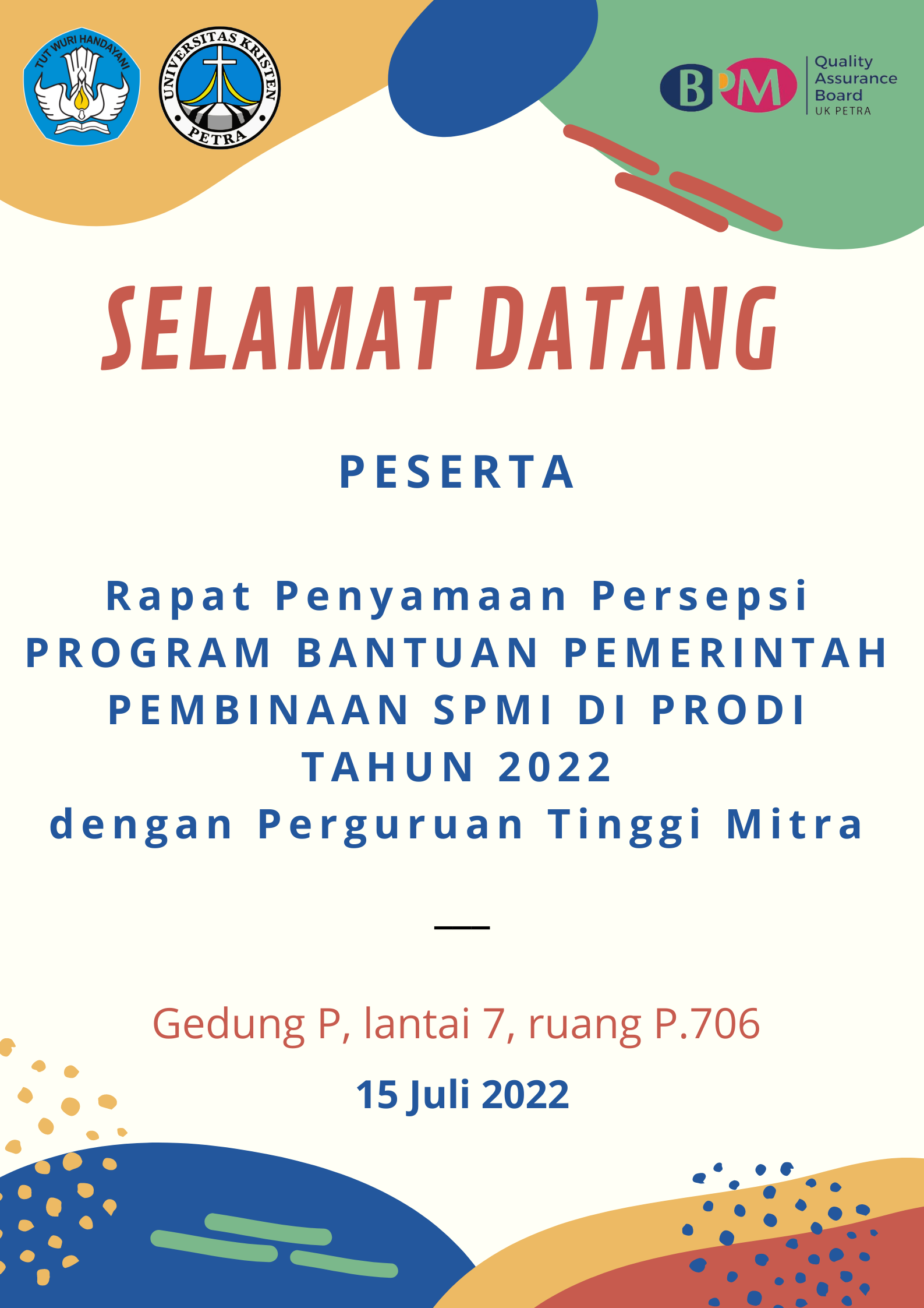 Rapat penyamaan persepsi program bantuan pemerintah pembinaan SPMI di prodi tahun 2022 dengan Perguruan Tinggi Mitra. Acara ini diselenggarakan pada 15 Juli 2022 bertempat di gedung P. lantai 7 ruang P.706.