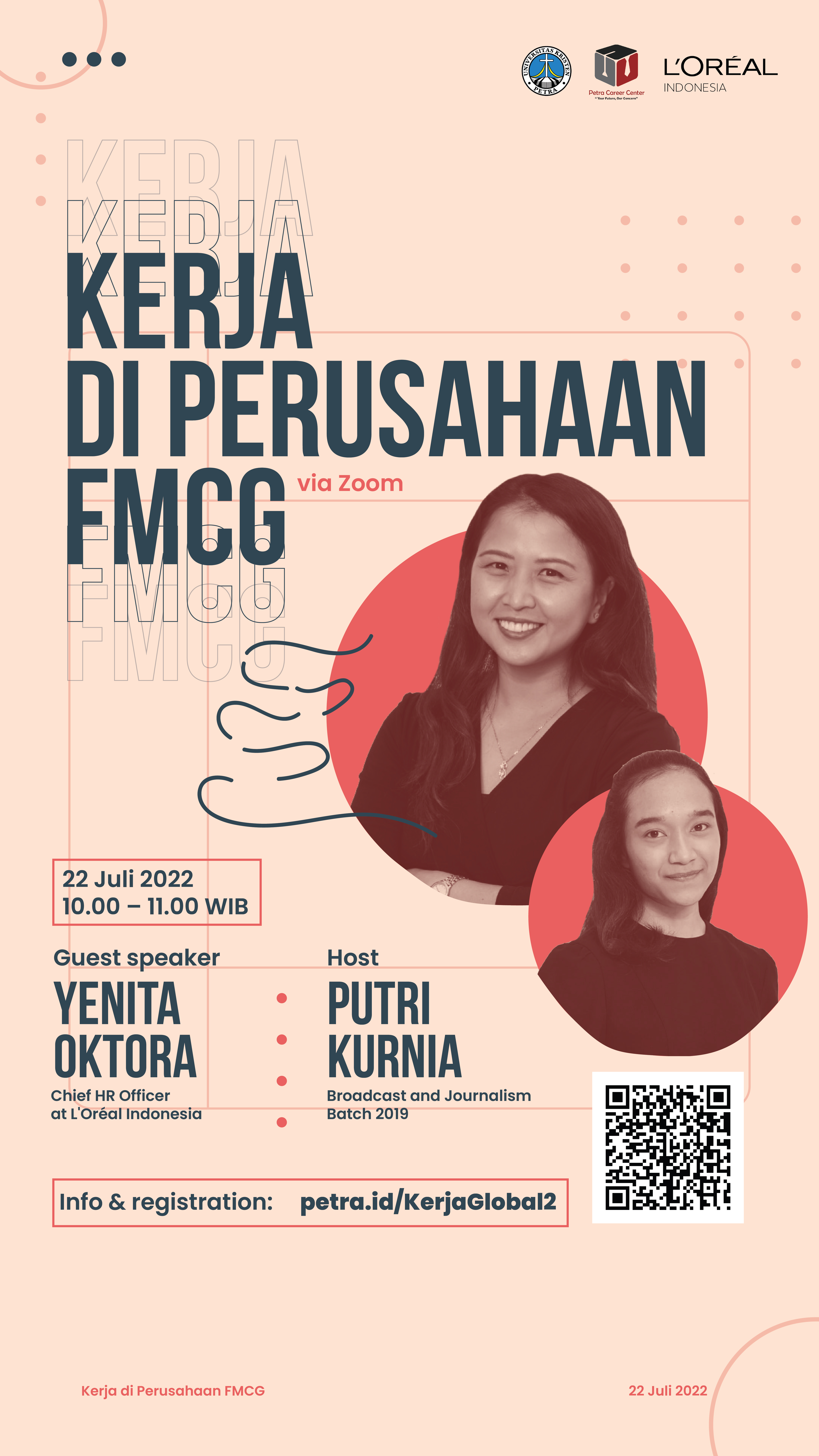 Webinar ini mengajak agar peserta mengetahui bagaimana seluk beluk bekerja di Industri FMCG dan ekspektasi perusahaan terhadap mereka yang hendak bekerja di perusahaan yang bergerak di industri tersebut. Selain itu meeka mendapatkan wawasan tentang employability skills apa yang diperlukan jika ingin bekerja di dunia kerja di bidang FMCG. Acara ini diselenggarakan pada 22 Juli 2022 jam 10.00 - 11.00 WIB. Dengan menghadirkan narasumber Yenita Oktora dari L'Oreal Indonesia.