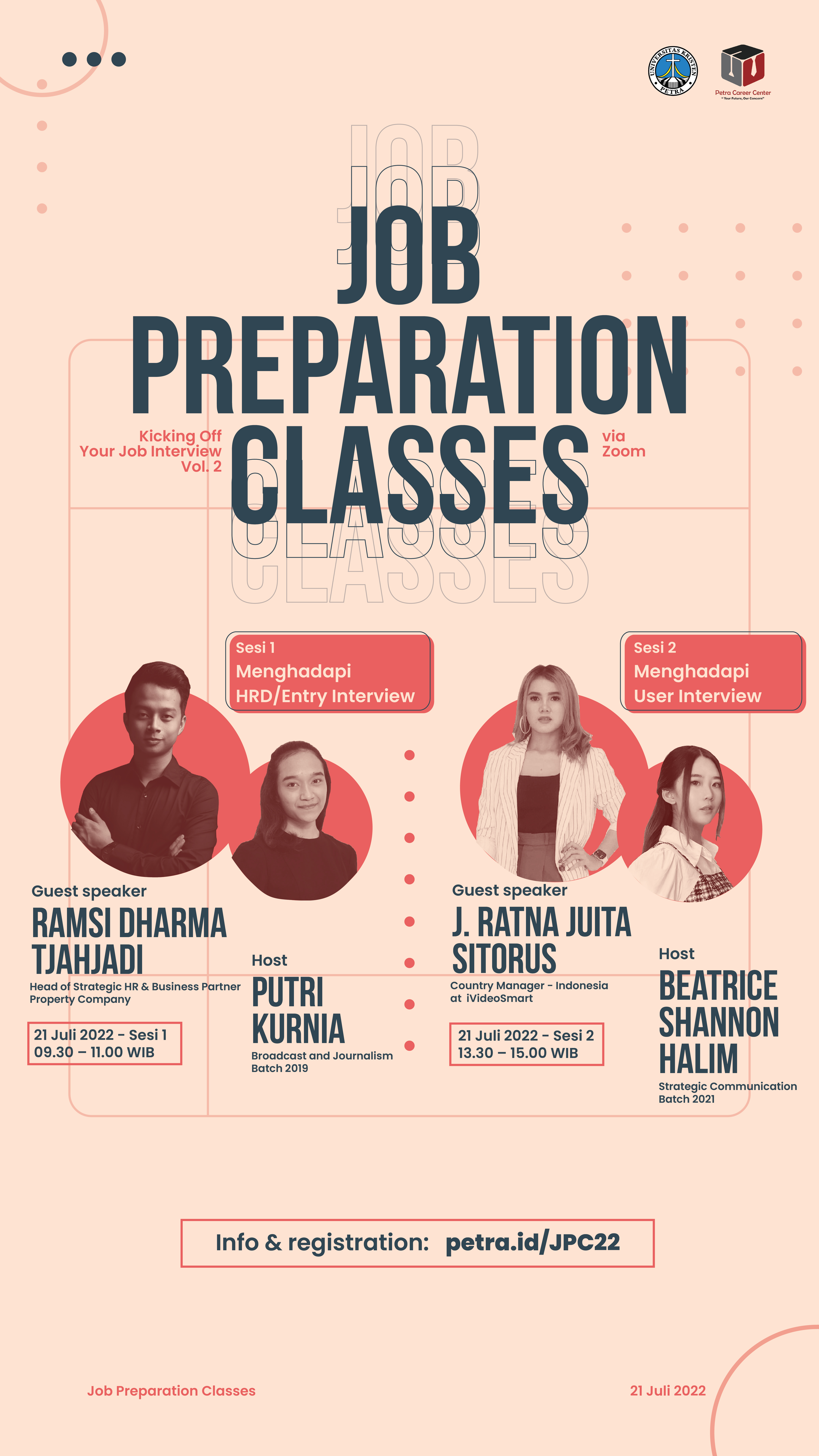 Melalui Virtual Job Preparation Classes ini sebagai job seeker tahu setiap tahapan-tahapan yang dipersiapakan terutama di tahap interview oleh HRD dan Interview User. Acara ini dilaksanakan pada tanggal 21 Juli 2022.