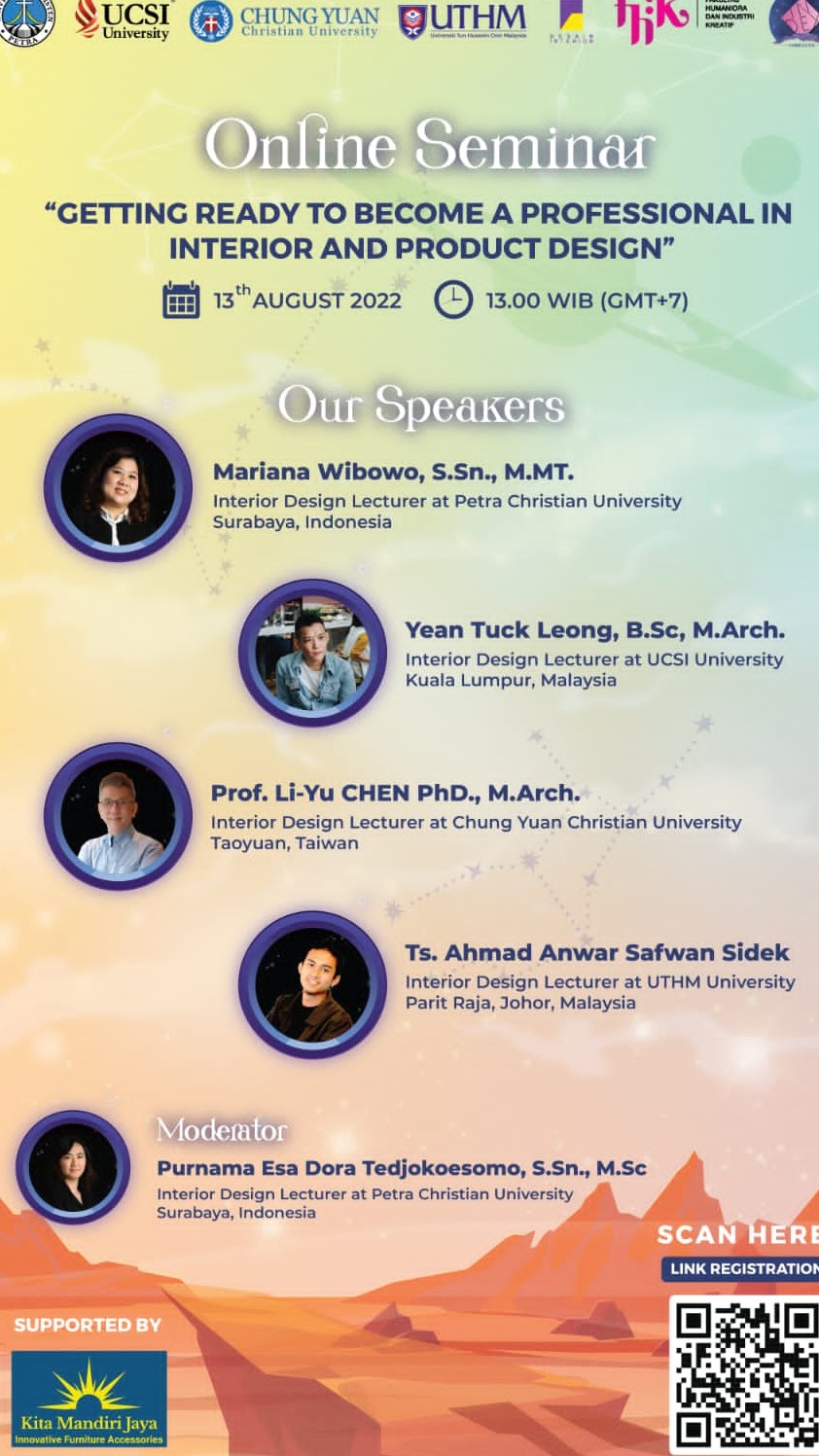 Pada tanggal 13 Agustus 2022, Program Studi Desain Interior UK Petra Surabaya mengadakan seminar dengan tema getting ready to become a professional in interior and product design. Acara ini dilaksanakan secara online dengan pembicara: Mariana Wibowo, S.Sn., M.MT. dan Yean Tuc Leong, B.Sc., M.Arch. serta Prof. Li-Yu Chen, Ph.D., dan Ts. Ahmad Anwar Safwan Sidek.