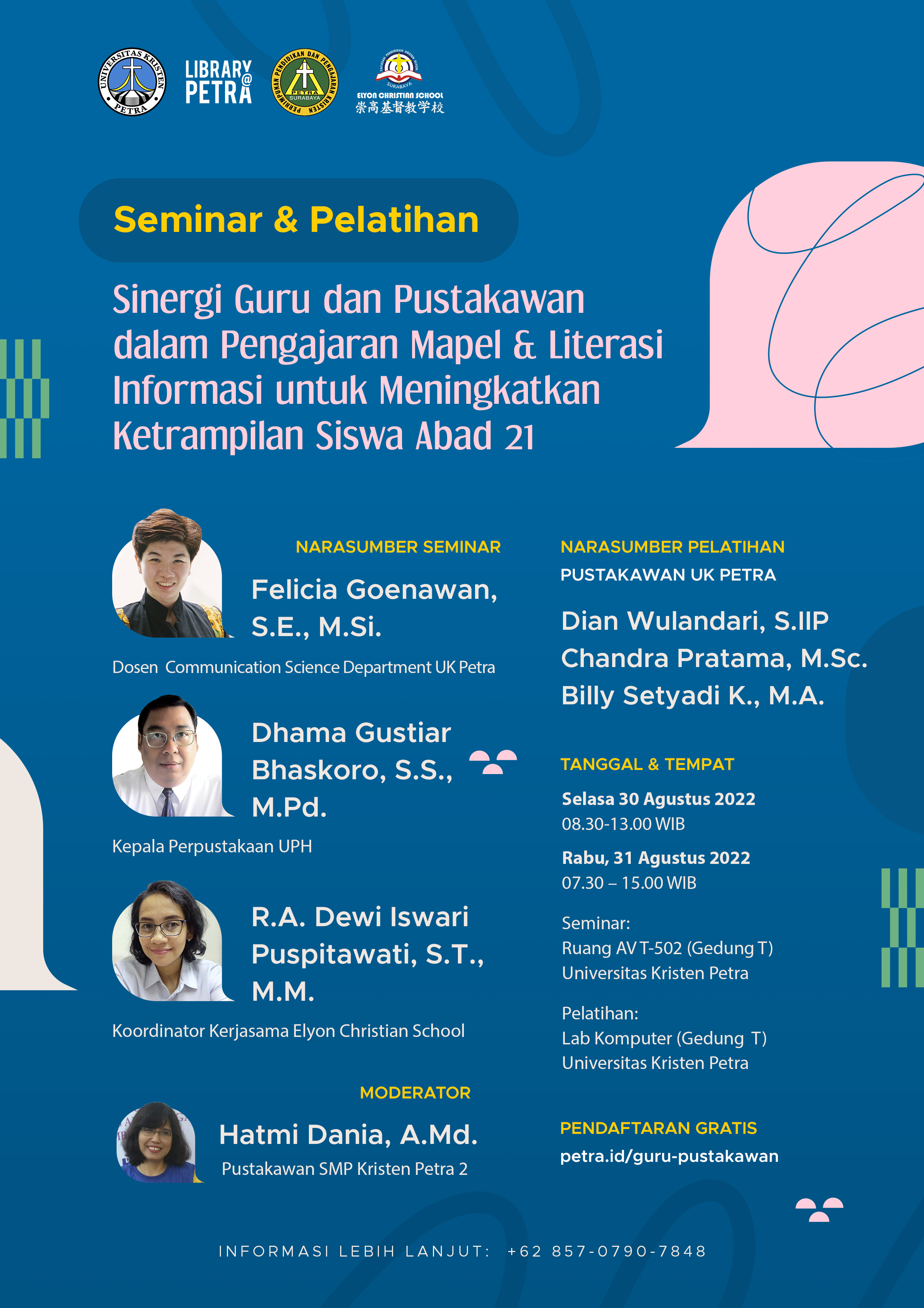 Perpustakaan UK Petra pada Senin-Selasa, 30-31 Agustus 2022 bertempat di Ruang AV-T.502 dan Lab Puskom T Gedung Fakultas Bisnis dan Ekonomi Universitas Kristen Petra, mengadakan acara seminar dan pelatihan dengan topik “Sinergi guru dan pustakawan dalam pengajaran mapel dan literasi informasi untuk meningkatkan keterampilan siswa abad 21".