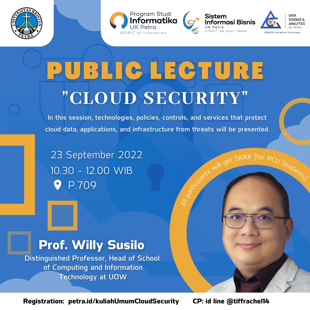 Pada tanggal 23 September 2022 jam 10.30 - 12.00 WIB bertempat di gedung P.709, Universitas Kristen Petra Surabaya, Program Studi Teknik Informatika menyelenggarakan acara Public Lecture demngan topik Cloud Security. Dengan mengundang bapak Prof. Willy Susilo sebagai narasumber. Pendaftaran untuk acara ini bisa dilihat petra.id/kuliahUmumCloudSecurity