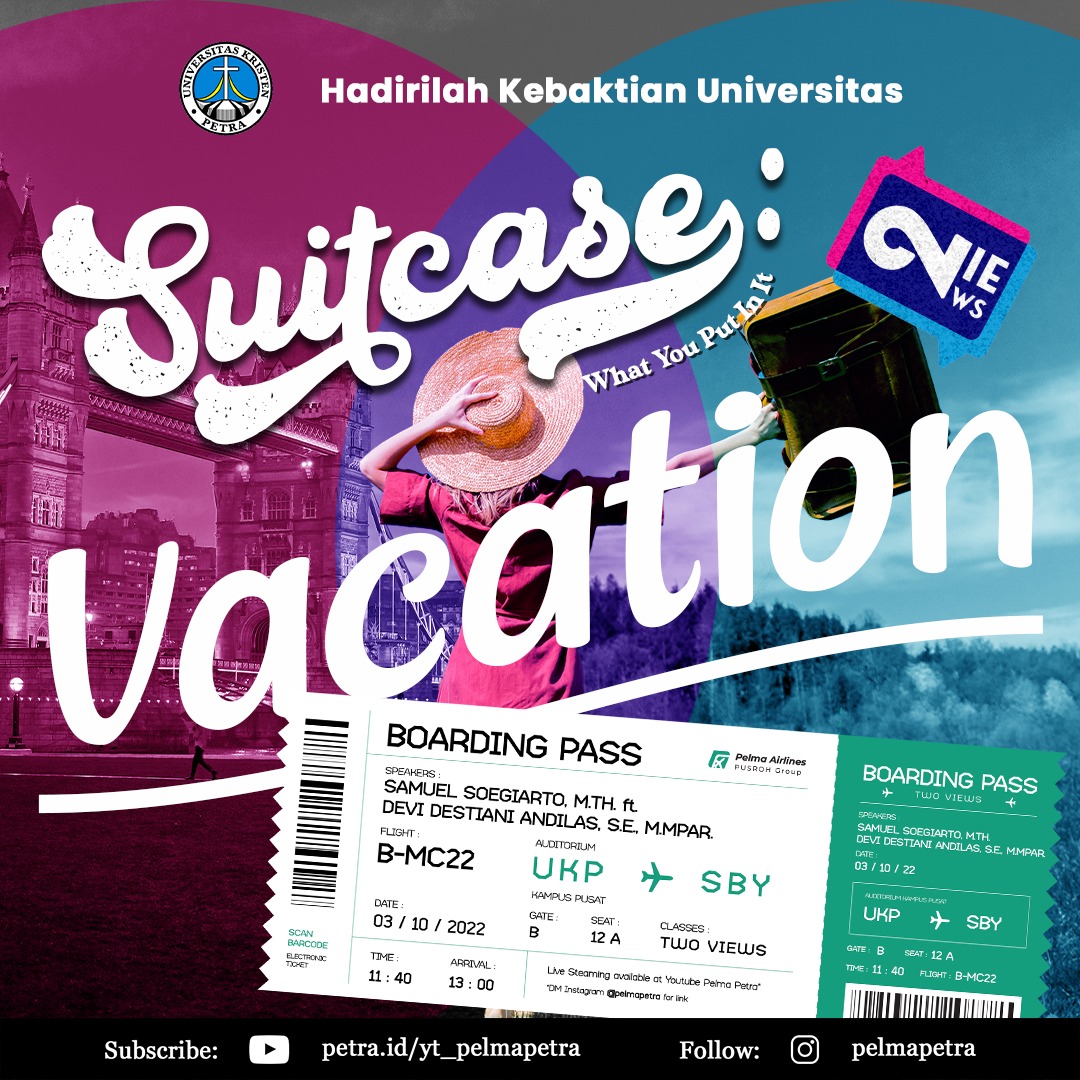 Senin, 03 Oktober 2022 jam 11.40-13.00 WIB bertempat di Auditorium kampus Pusat, diadakan kebaktian Universitas setiap hari Senin. Pada kali ini mengambil tema suitcase what you put in it vacation dengan pengkhotbah Bapak Samuel Soegiharto dan Ibu Devi.