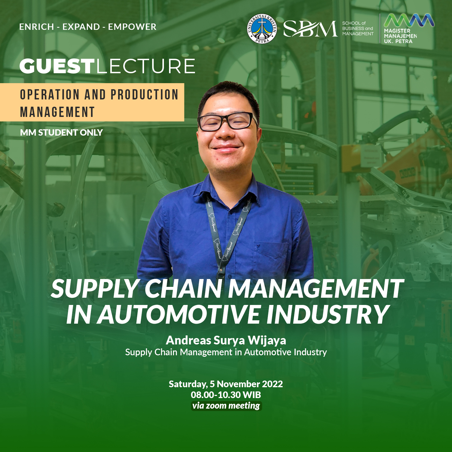 Sabtu, 05 November 2022 jam 08.00 - 10.30 WIB, Program Studi Magister Manajemen akan mengadakan kuliah tamu dengan mengangkat tema Supply Chain Management In Automotive Industry, dengan narasumber Andreas Surya Wijaya.
