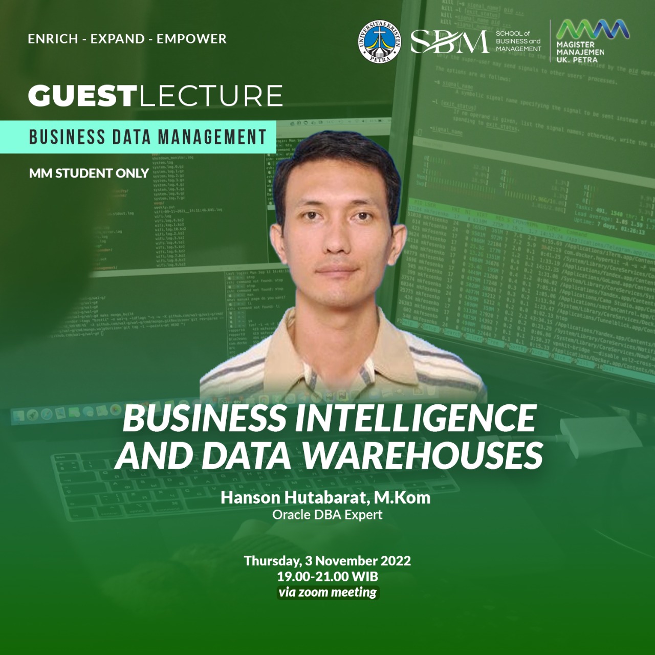 Kamis, 03 November 2022 jam 19.00 - 21.00 WIB, Program Studi Magister Manajemen akan mengadakan kuliah tamu dengan mengangkat tema Business intelligence and data warehouses, dengan narasumber Hanson Hutabarat, M.Kom.