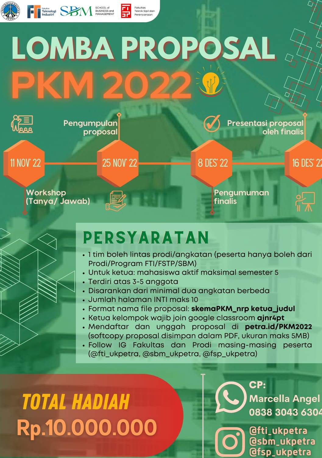Fakultas Teknologi Industri Universitas Kristen Petra mengadakan acara Lomba proposal PKM 2022. Dengan memperebutkan total hadiah Rp.10.000.000,- Pendaftran dibuka dari tanggal 11 November 2022.