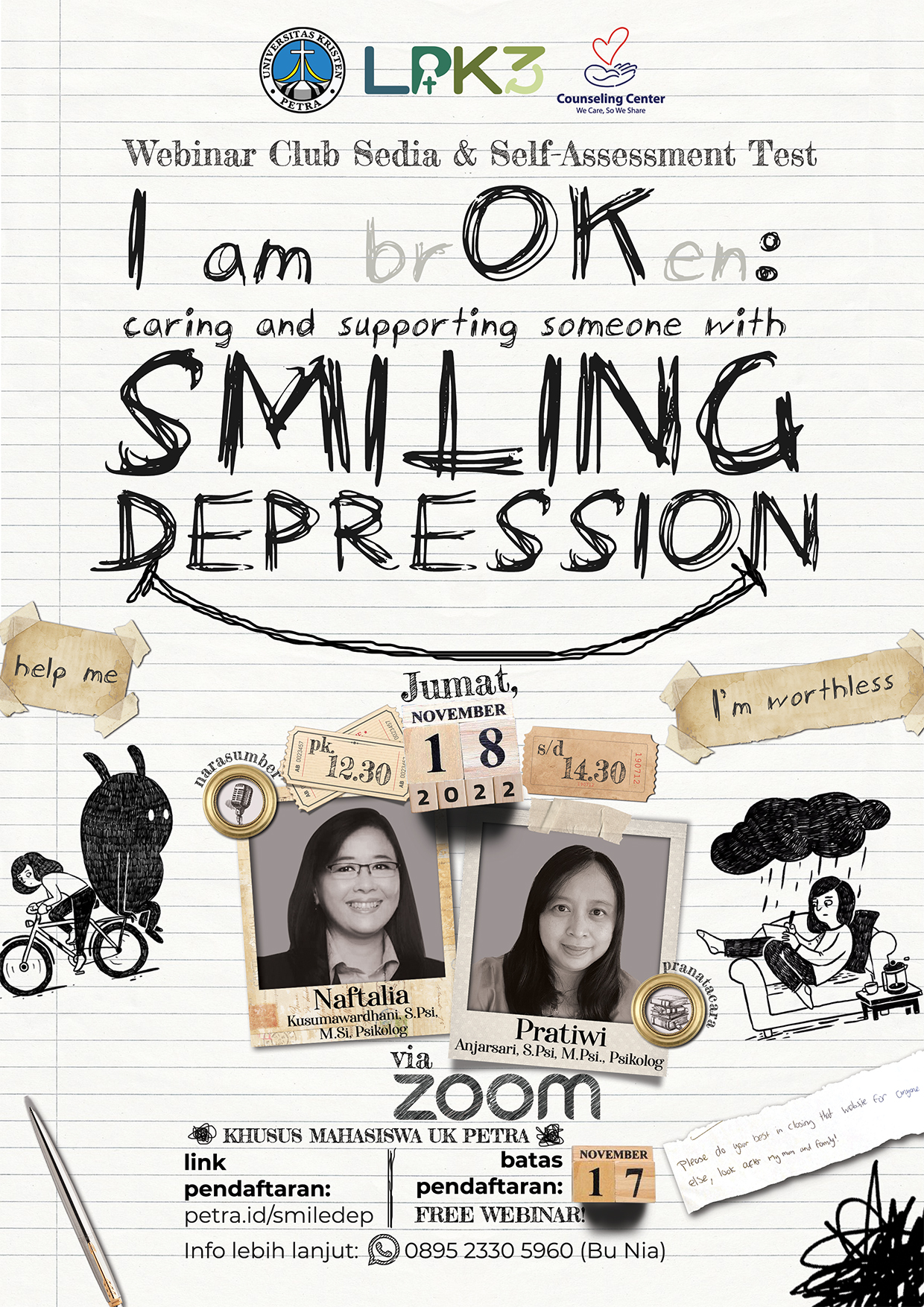 Pusat Konseling dan Pengembangan Pribadi UK Petra, mengadakan acara self assessment test & webinar club sedia. Webinar yang diadakan khusus untuk mahasiswa UK Petra guna membekali peserta ketika menghadapi rekan/kenalan yang sedang mengalami depresi. Dengan narasumber Naftalia Kusuwardhani, S.Psi., M.Si (Psikologi) dan Pratiwi Anjarsari, S.Psi., M.Si (Psikologi), diadakan pada tanggal 18 November 2022 jam 12.30 - 14.30 WIB.