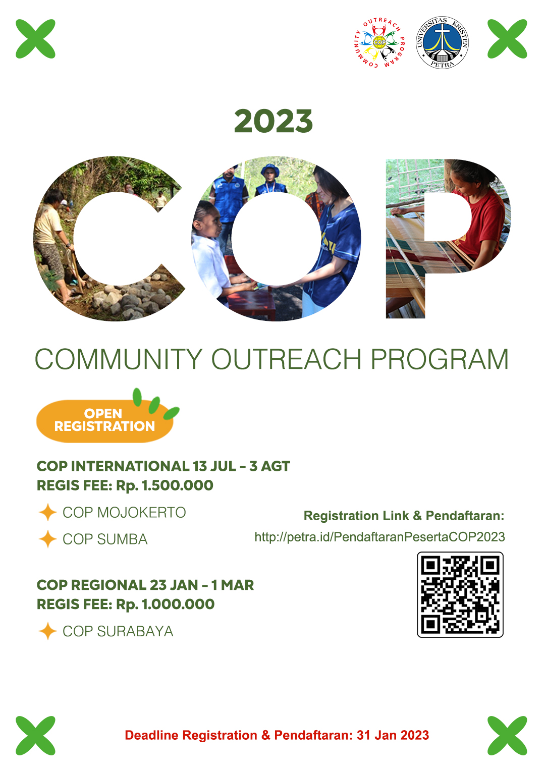 COP 2023 adalah salah satu kegiatan Internasional service learning yang diadakan oleh UK Petra untuk mahasiswa dapat mengeksplor hal baru dan membantu masyarakat ditempat kegiatan berlangsung. Kegiatan COP kali ini dilaksanakan di tiga tempat dengan dua kategori yaitu COP internasional yang berlokasi di Mojokerto dan Sumba, serta kategori COP regional yang berlokasi di Surabaya. Pendaftaran dibuka pada tanggal 23 Jan - 01 Mar 2023.