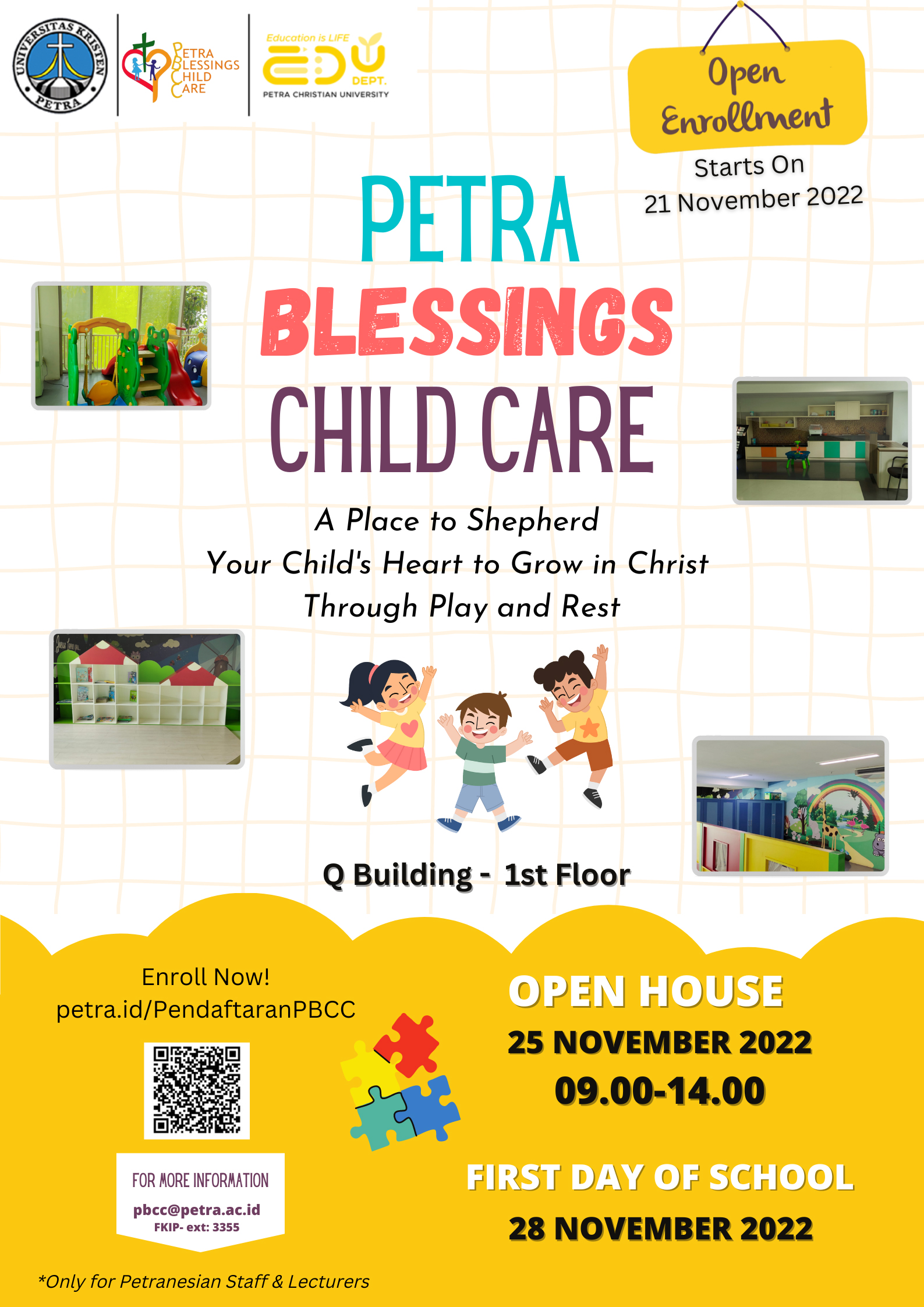Petra blessing child care yang digagas oleh Program Studi Pendidikan Guru SD Universitas Kristen Petra Surabaya telah dibuka, untuk itu telah dibuka pendaftaran bagi staf Dosen dan tenaga kependidikan yang akan memanfaatkan layanan ini.