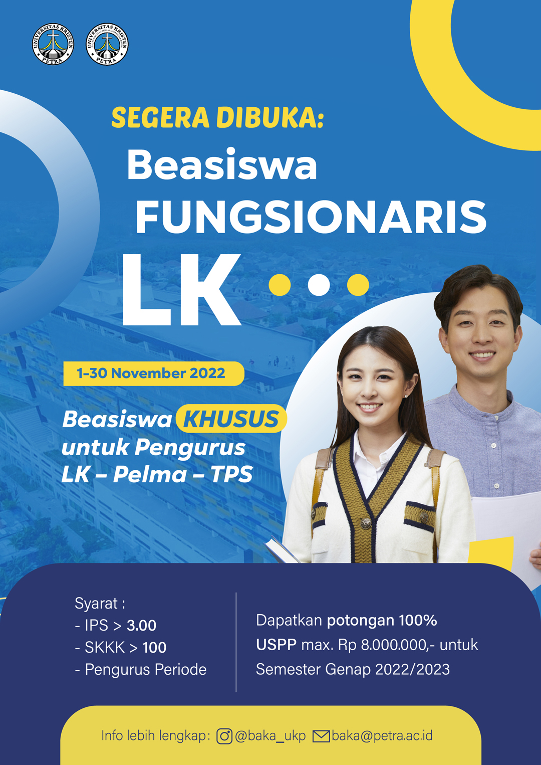 Universitas Kristen Petra Surabaya membuka pendaftaran beasiswa bagi fungsionaris Lembaga Kemahasiswaan Periode 2022/2023. Pendaftaran dibuka pada tanggal 1-30 November 2022.