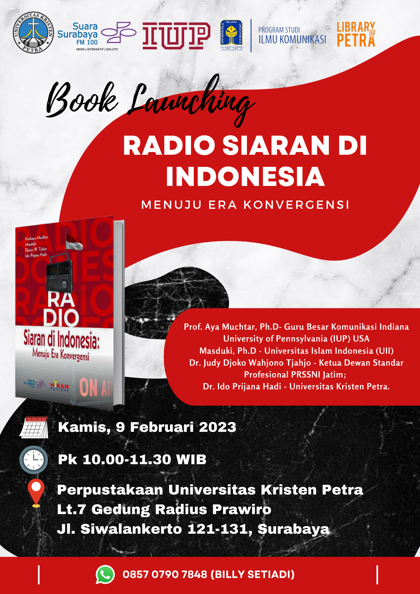 Acara Book Launching "Radio Siaran di Indonesia Menuju Era Konvergensi" ini diselenggarakan oleh Prodi Ilmu Komunikasi dan Perpustakaan Universitas Kristen Petra, dilaksanakan di Perpustakaan UK Petra pada tanggal 9 Februari 2023 pukul 10.00 - 11.30 WIB.
