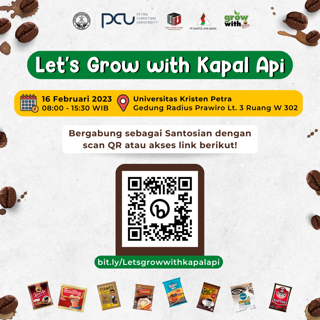 Pusat Karir Universitas Kristen Petra Surabaya bekerja sama dengan PT. Santos produsen Kapal Api, mengadakan rekrutmen karyawan. Acara ini diselenggarakan pada 16 Februari 2023 jam 08.00 - 15.30 WIB, bertempat di Gedung Radius Prawiro W.302.