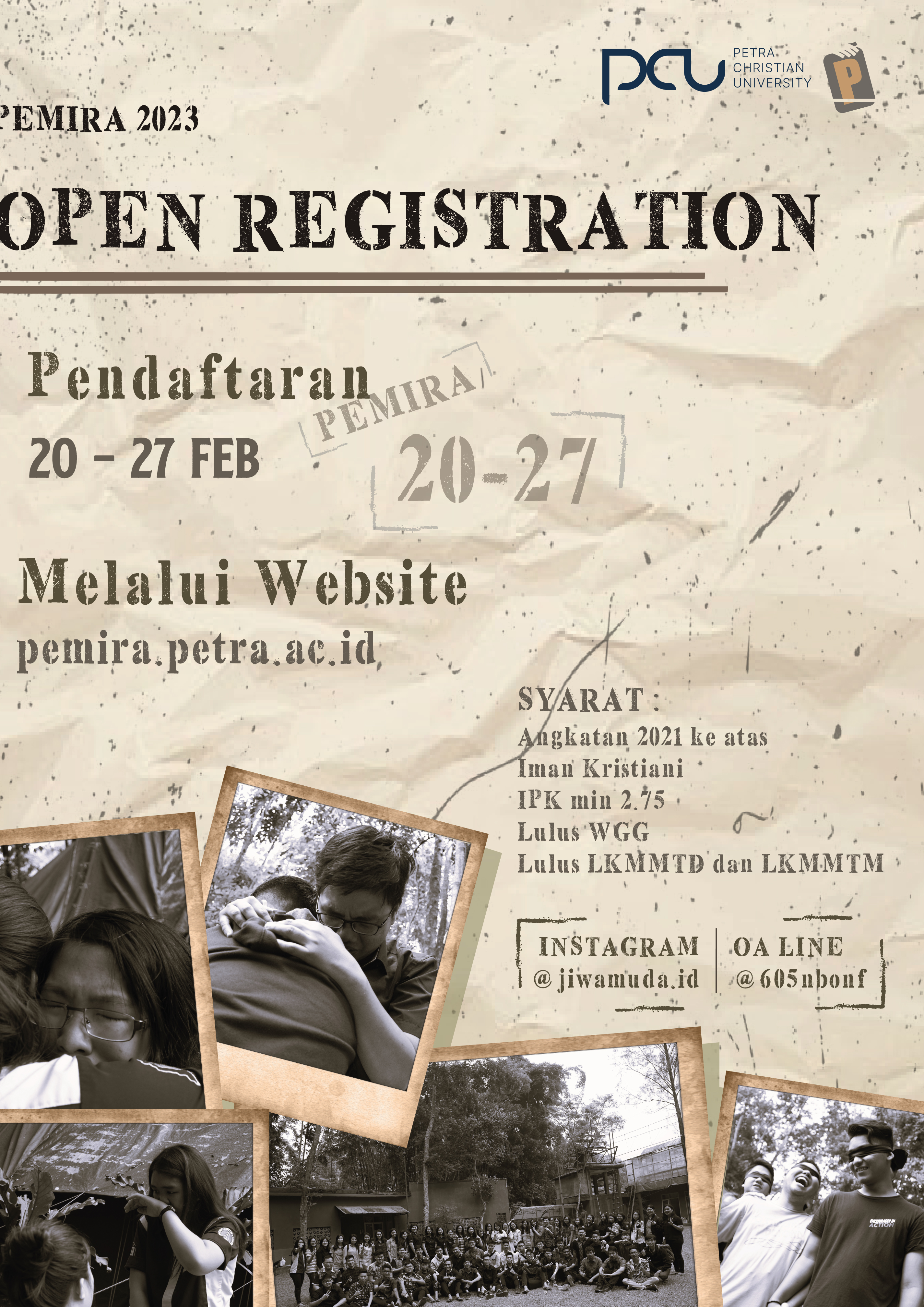 Dalam rangka mempersiapkam Pemilu Raya 2023 dilingkup Badan Kemahasiswaan UK Petra, maka dibuka pendaftaran untuk menjadi panitia Pemilu Raya 2023. Pendaftaran dibuka dari tanggal 20-27 Februari 2023. Info lebih lengkap ada di pemira.petra.ac.id