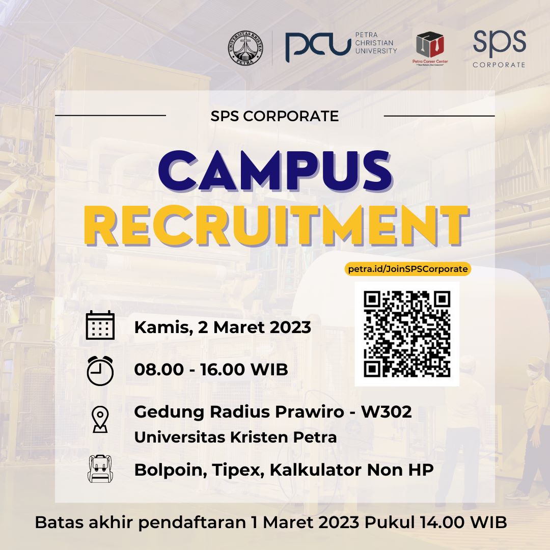 Pusat Karir Universitas Kristen Petra Surabaya bekerja sama dengan SPS, mengadakan rekrutmen karyawan. Acara ini diselenggarakan pada 02 Maret 2023 jam 10.00 - 13.00 WIB, bertempat di Gedung Radius Prawiro W.302.