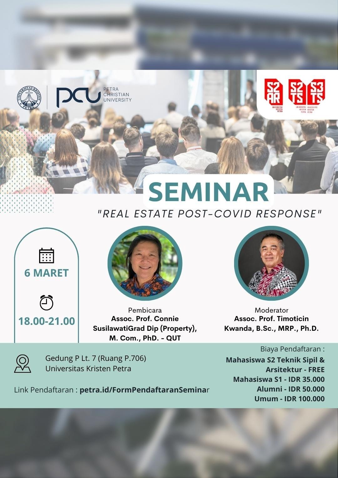 Seminar real estate post covid response diselenggarakan oleh Program Studi Magister Teknik Sipil Universitas Kristen Petra Surabaya,