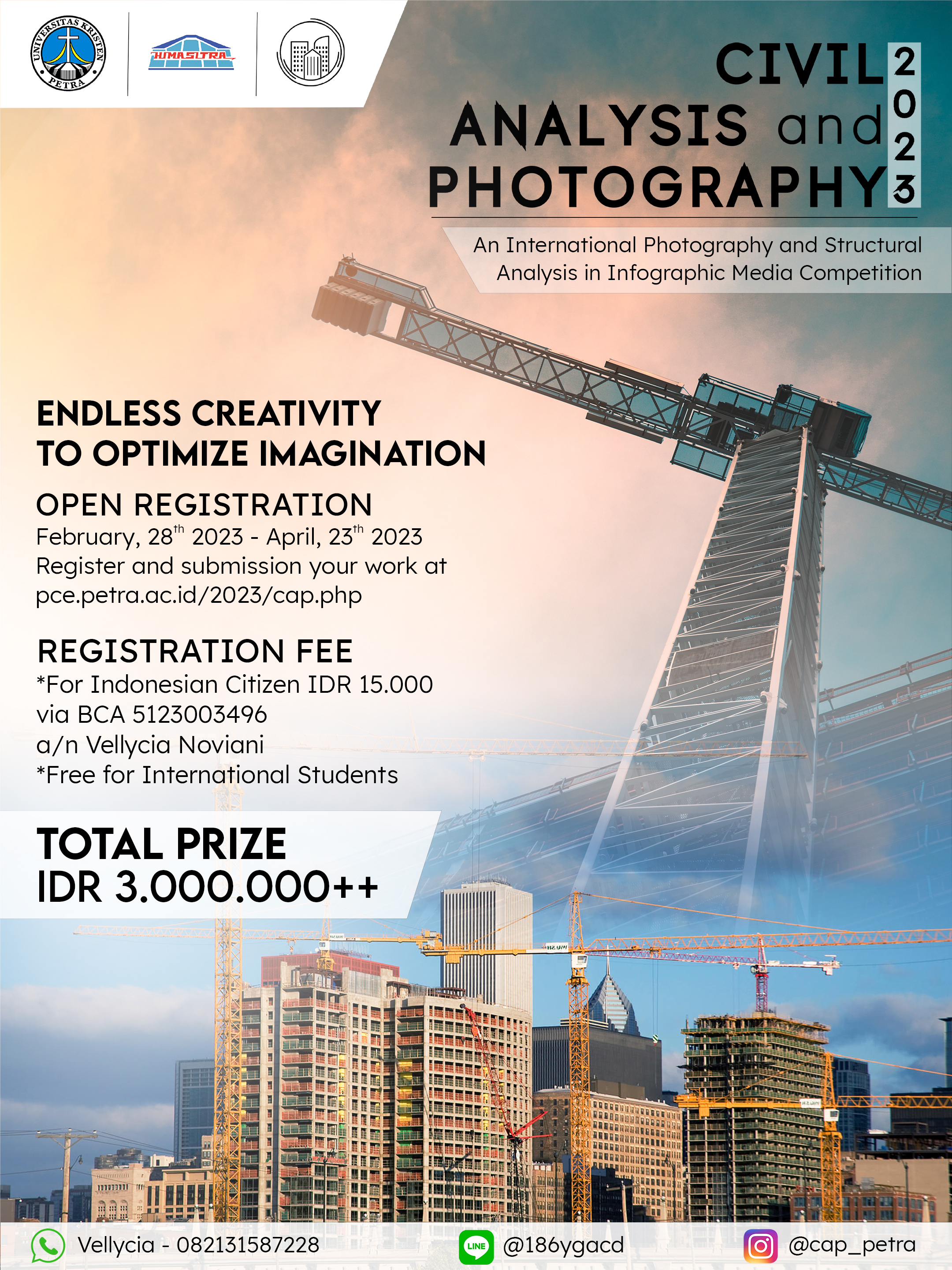 Civil Analysis and Photography 2023 merupakan acara tahunan yang di selengarakan oleh HIMASITRA, di mana para peserta akan memotret sebuah struktur bangunan lalu peserta juga akan menganalisa struktur tersebut. Pada tahun ini Civil Analysis and Photography membuka pendaftaran untuk seluruh kategori umur, dengan harapan orang-orang semakin banyak yang tertarik pada bidang Teknik Sipil. Pengumpulan karya pada tanggal: 28 Februari - 23 April 2023.