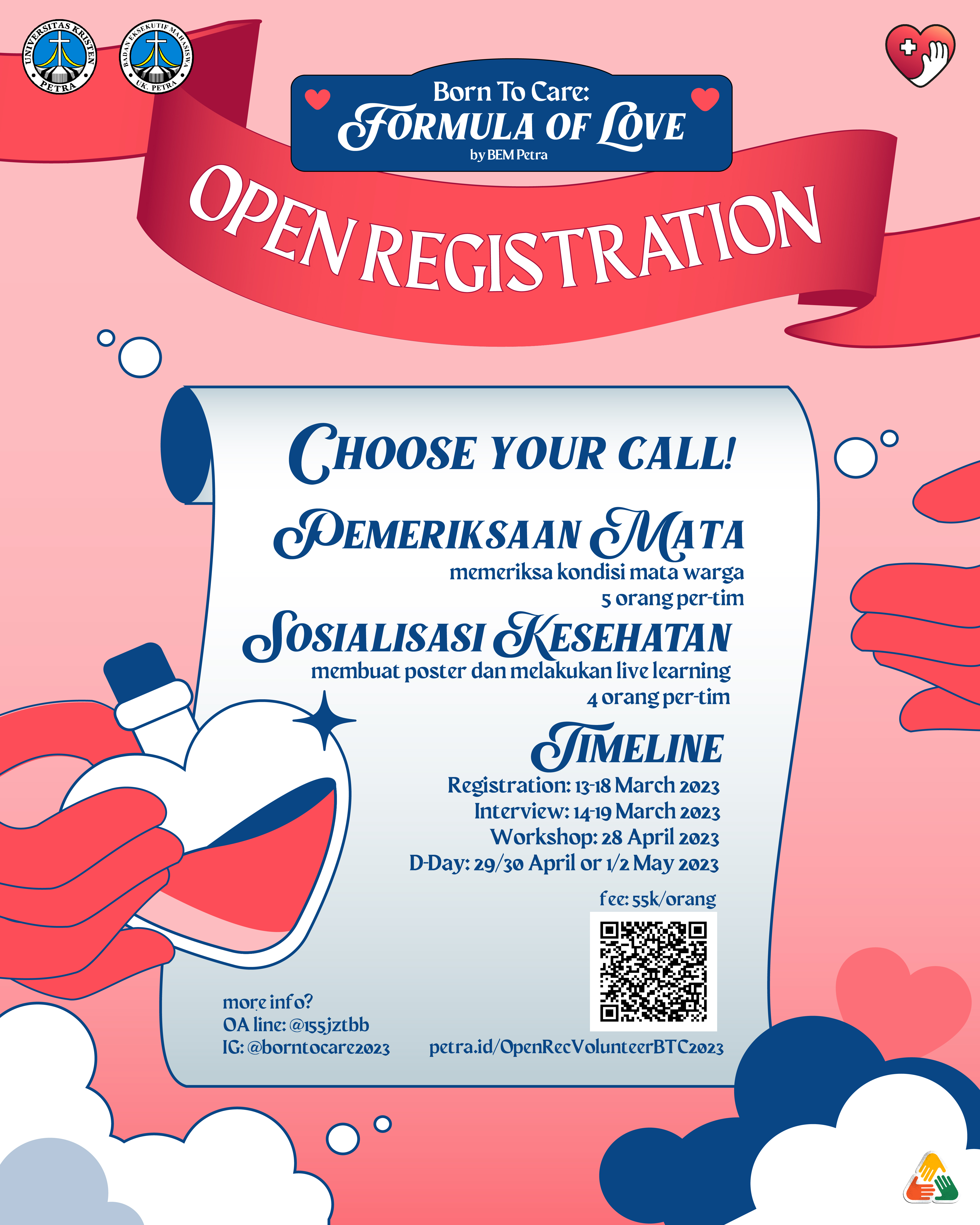 BEM UK Petra Surabaya membuka kesempatan bagi mahasiswa UK Petra untuk turut serta dalam kegiatan berbagi sesama warga sekitar kampus. Kegiatan baru dari Badan Eksekutif Mahasiswa untuk seluruh mahasiswa yang memiliki keinginan untuk meningkatkan tingkat kesehatan warga Indonesia. Dalam kegiatan ini, ada dua sektor yakni pemeriksaan mata dan sosialisasi kesehatan. Untuk info lebih lanjut bisa dilihat di petra.id/OpenRecVolunteerBTC2023.