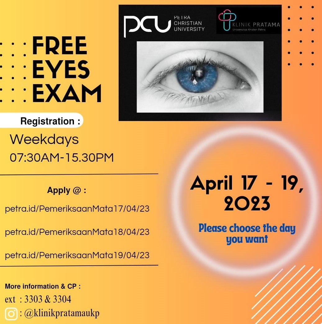 Pada tanggal 17-19 April 2023 Poliklinik UK Petra akan mengadakan pemeriksaan mata secara gratis.