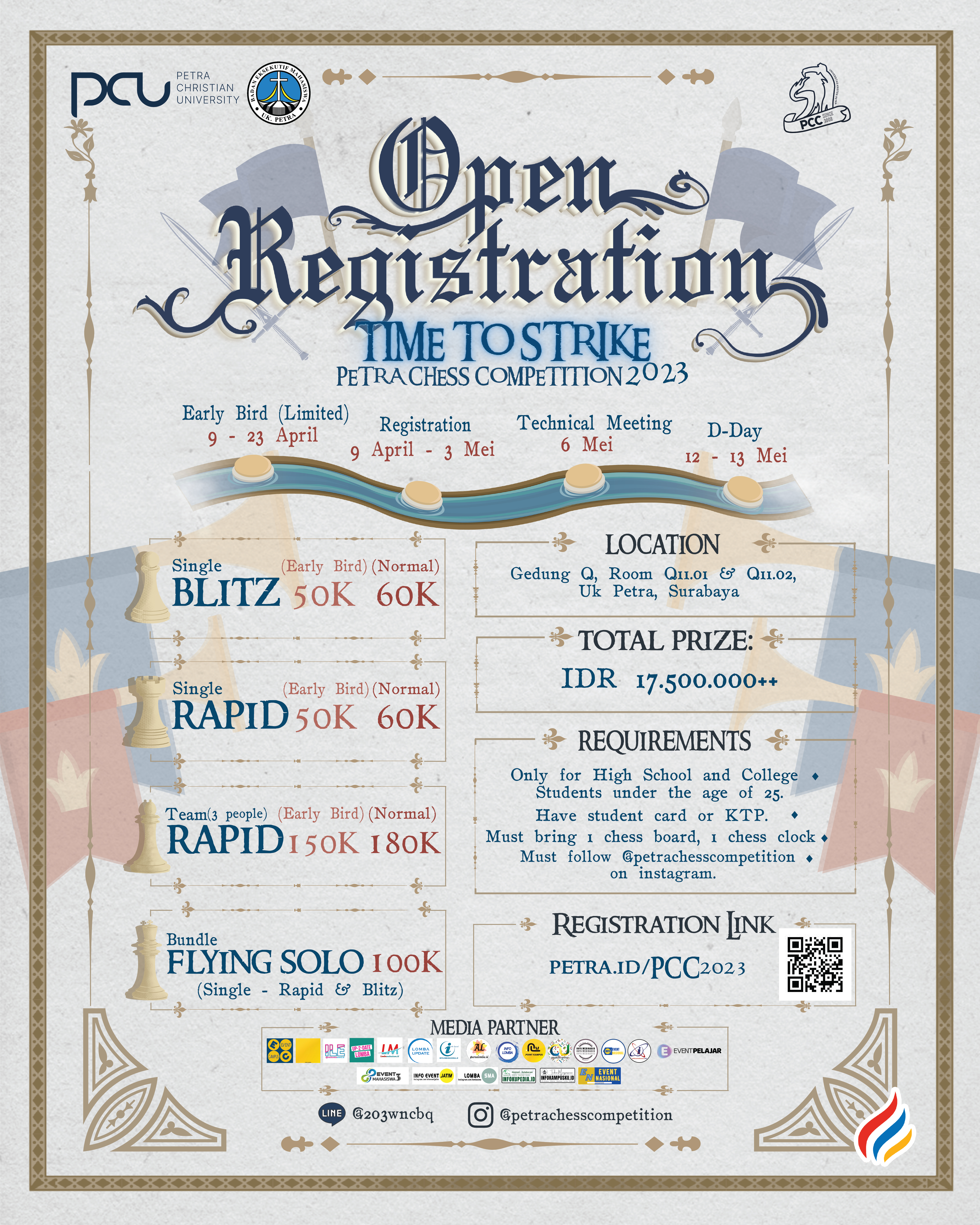 Petra Chess Competition kembali lagi loh tahun ini!!! Tema Petra Chess Competition tahun ini adalah 'Time to Strike Pastinya seru banget dong! Apalagi total hadiah mencapai Rp 17.500.000!!!