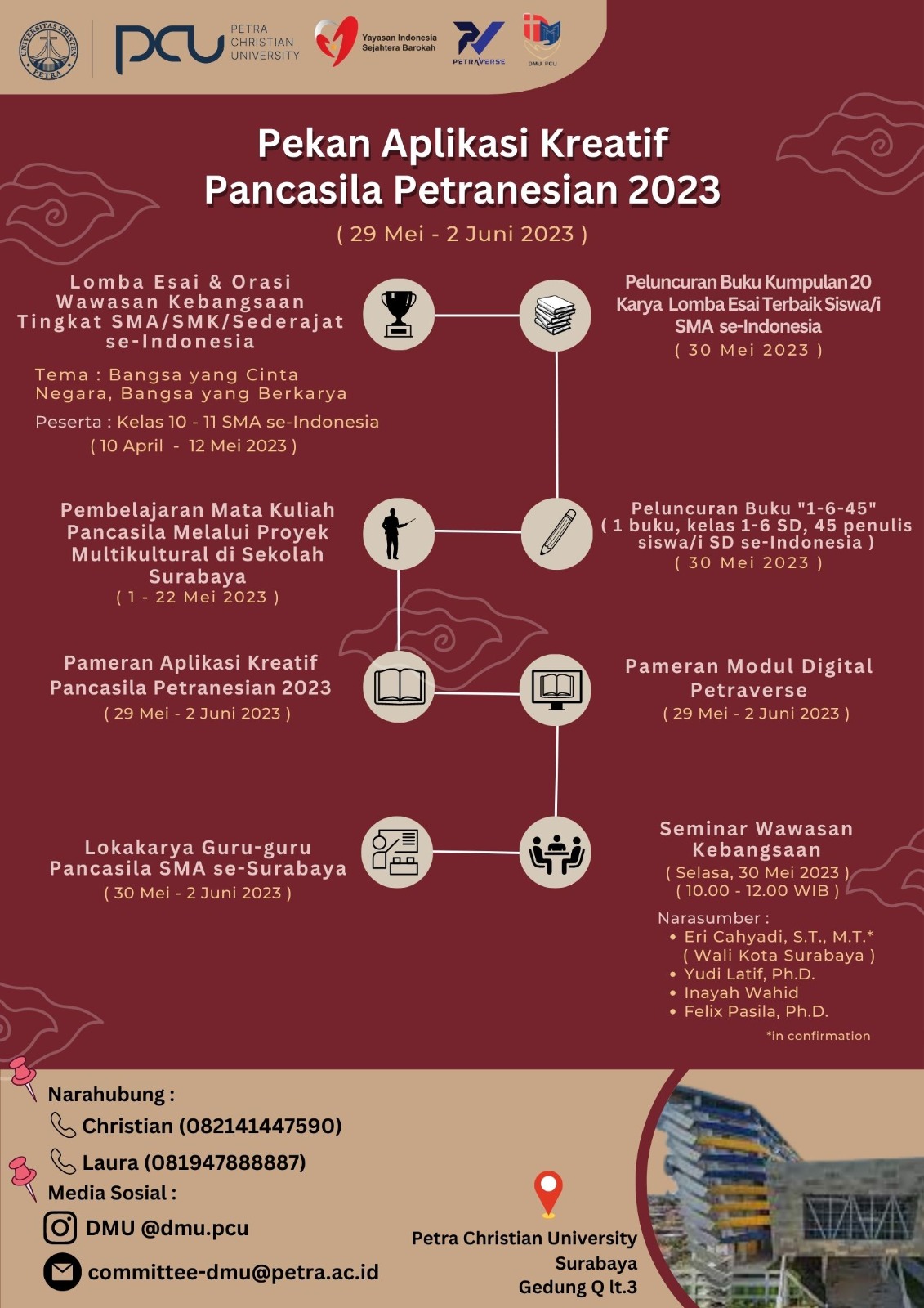 Pada tanggal 29 Mei - 2 Juni 2023 Departemen Mata Kuliah Umum Universitas Kristen Petra Surabaya mengadakan acara Pekan aplikasi kreatif Pancasila Petranesian 2023. Selama 1 Minggu diadakan berbagai macam acara yang berkaitan dengan wawasan kebangsaan.