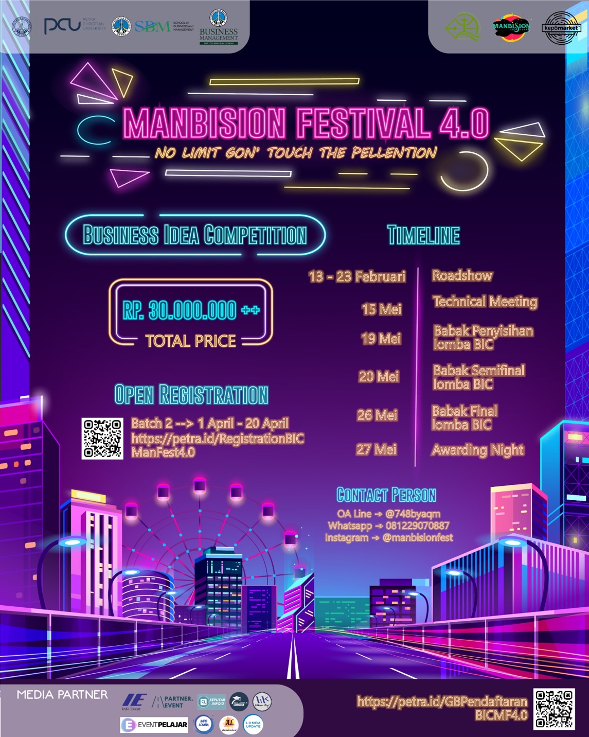 Program Manajemen Bisnis UK Petra Surabaya mengadakan acara Manbision Festival 4.0. Acara ini cocok bagi yang berminat mengembangkan pengetahuannya tentang manajemen dan bisnis. Diadakan lomba perencanaan bisnis, untuk pengumuman pemenang dilaksanakan pada tanggal 27 Mei 2023.