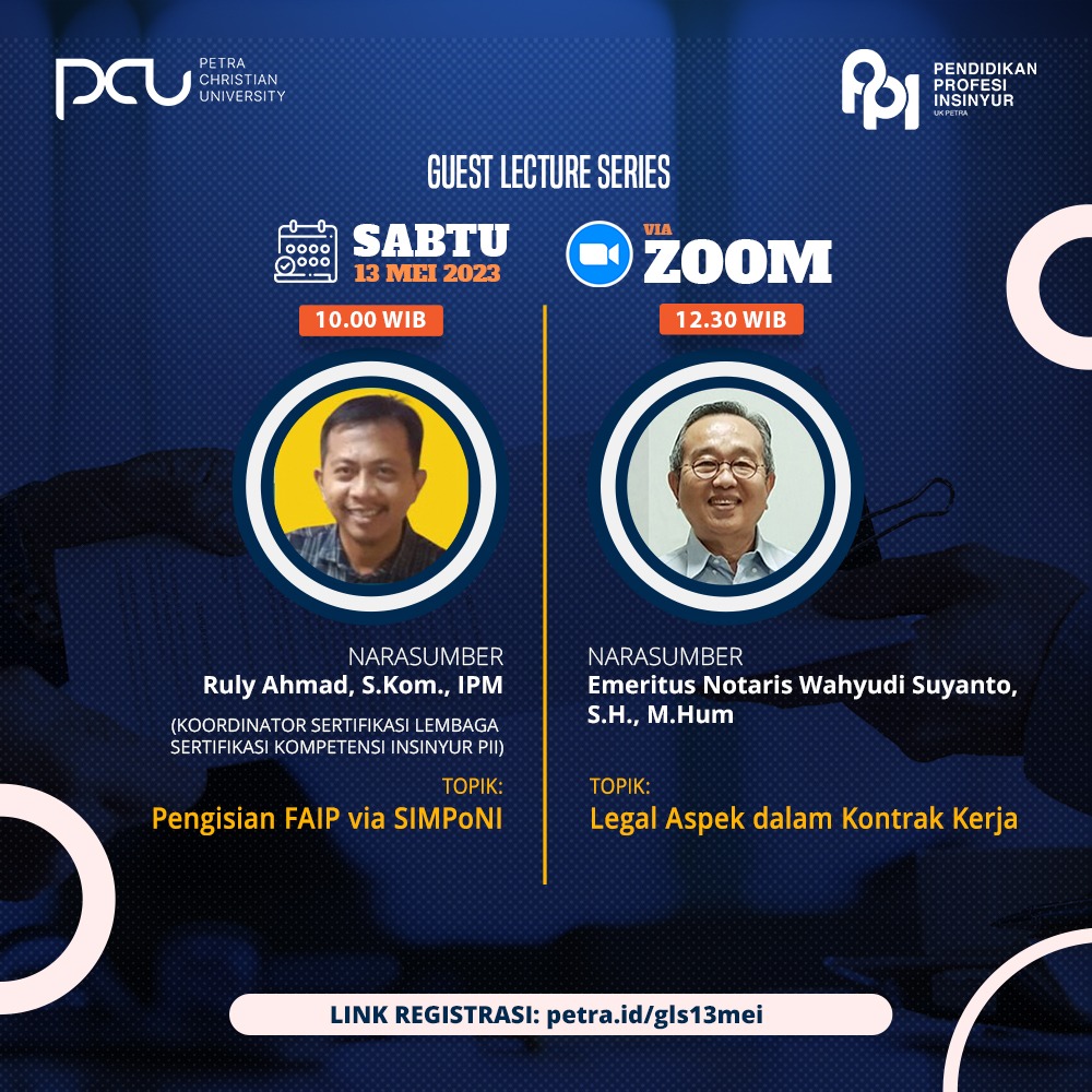 Program Pendidikan Profesi Insinyur UK Petra mengadakan kuliah tamu pada Sabtu, 13 Mei 2023 jam 10.00 - selesai. Acara ini dilaksanakan secara online dengan aplikasi Zoom dengan narasumber Rully Ahmad, S.Kom. dan Emeritus Notaris Wahyudi Susanto, M.Hum.