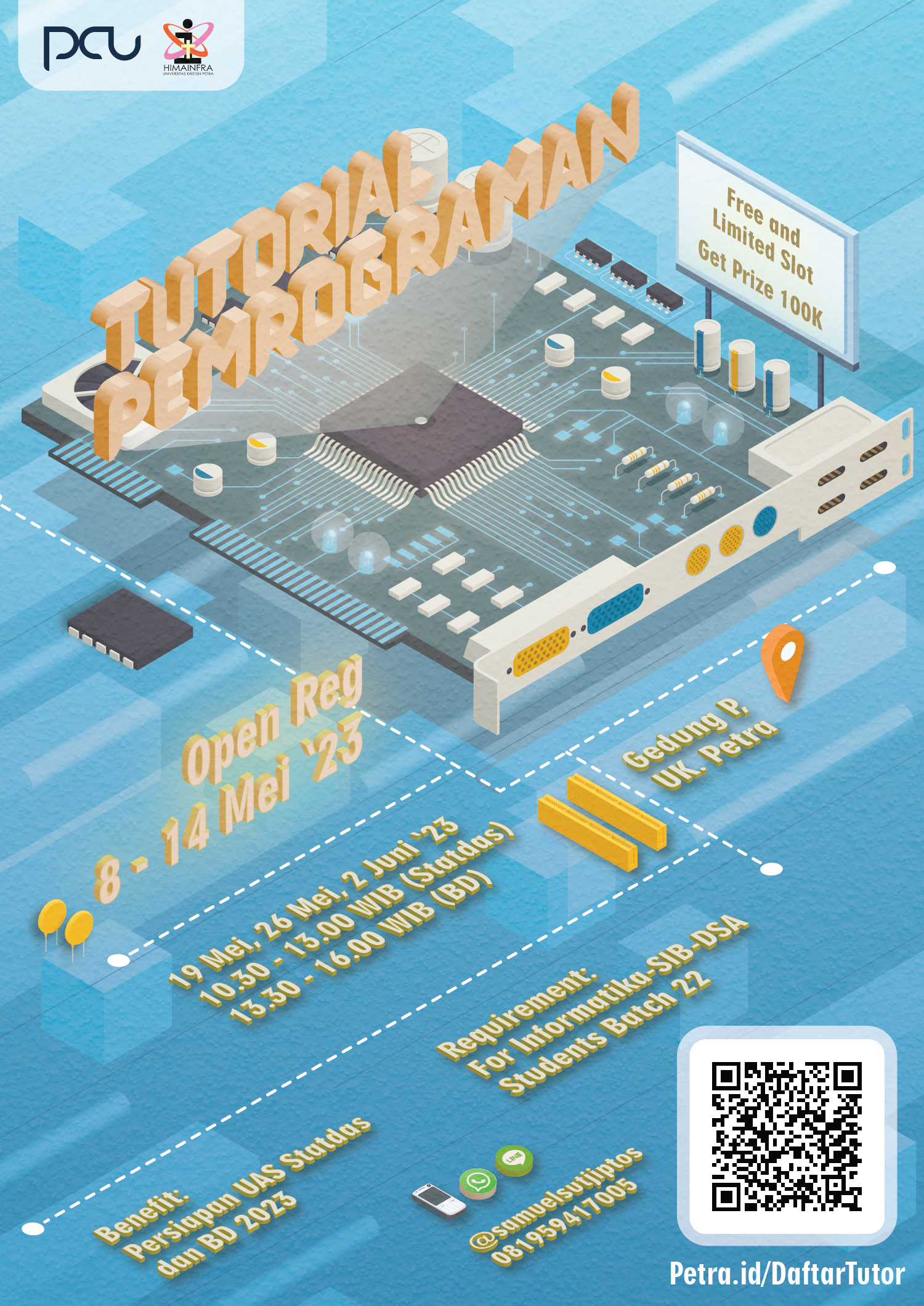 Tutorial Pemrograman merupakan sebuah kegiatan tutorial bagi Mahasiswa angkatan 2022 jurusan Informatika, SIB, dan DSA yang bertujuan untuk persiapan UAS. Mata kuliah yang dijadikan pelatihan adalah Statistika Dasar dan Basis Data. Acara ini dilaksanakan pada 19 Mei, 26 Mei, 02 Juni 2023. Untuk pendaftaran peserta dibuka pada tanggal 08 - 14 Mei 2023.