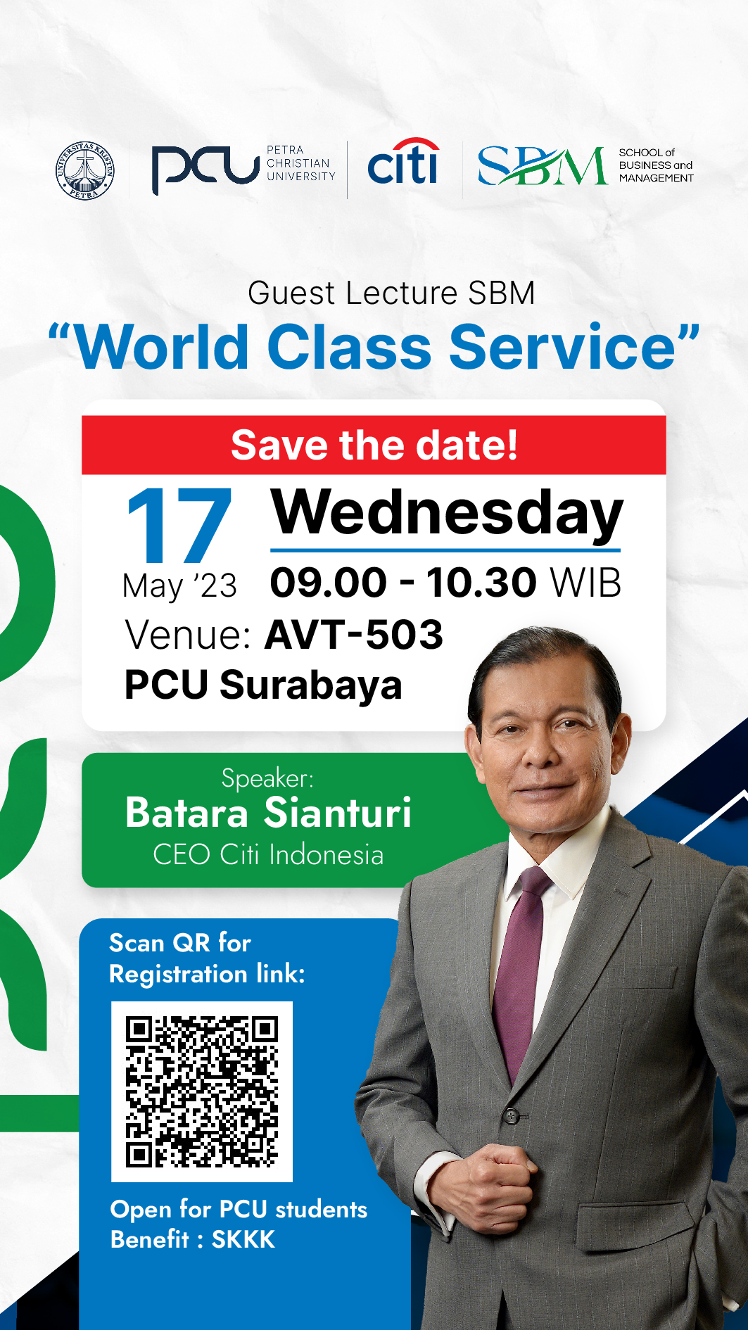 Kuliah tamu dengan tema "World class service" diadakan oleh School of Business and Management UK Petra Surabaya. Pada tanggal 17 Mei 2023 jam 09.00 - 10.30 WIB. Dengan narasumber Batara Sianturi. Kegiatan ini merupakan kuliah tamu yang dipelopori oleh Petra Career Center yang bekerjasama dengan School of Business and Management.