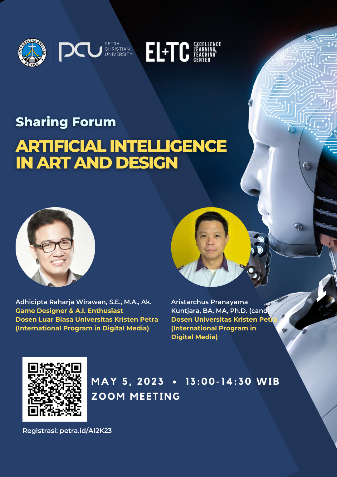 Penggunaan artificial intelligence didalam seni dan desain, menjadi topik pembahasan dalam acara sharing forum yang diadakan oleh ELTC Universitas Kristen Petra Surabaya. Dengan menghadirkan Adhicipta Raharja Wirawan, M.A.,AK. dan Aristarchus Pranayama Kuntjara, sebagai narasumber M.A. acara ini diselenggarakan pada 05 Mei 2023 jam 13.00 -14.00 WIB.