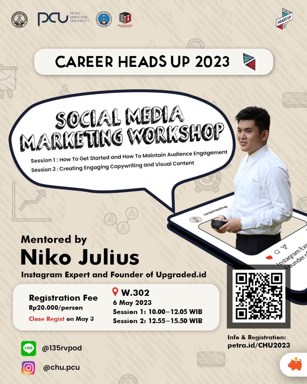 Acara workhsop ini bertujuan untuk mempersiapkan mahasiswa UK Petra dalam menjalankan bisnis di dunia sosial media. Selain itu, mahasiswa mampu merencanakan pemasaran bisnis dengan lebih baik serta mengevaluasi sosial, media, marketing yang digunakan untuk mendapatkan formulasi yang tepat untuk target bisnis mereka dan memahami cara dalam menyampaikan pesan yang mengundang audience engagement melalui copywriting dan visual content. Acara ini diselenggarakan pada 06 Mei 2023 dengan narasumber Niko Julius.
