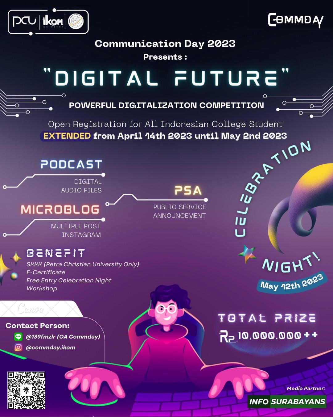 Communication day 2023 mengangkat Tema 'Digital Future'. Melalui Tema ini, lomba dibuat menyasar mahasiswa UKP dan universitas lain untuk berpartisipasi aktif dan memahami bahwa dunia digital yang berkembang pesat sangat mempengaruhi komunikasi. Acara ini digelar pada 12 Mei 2023.
