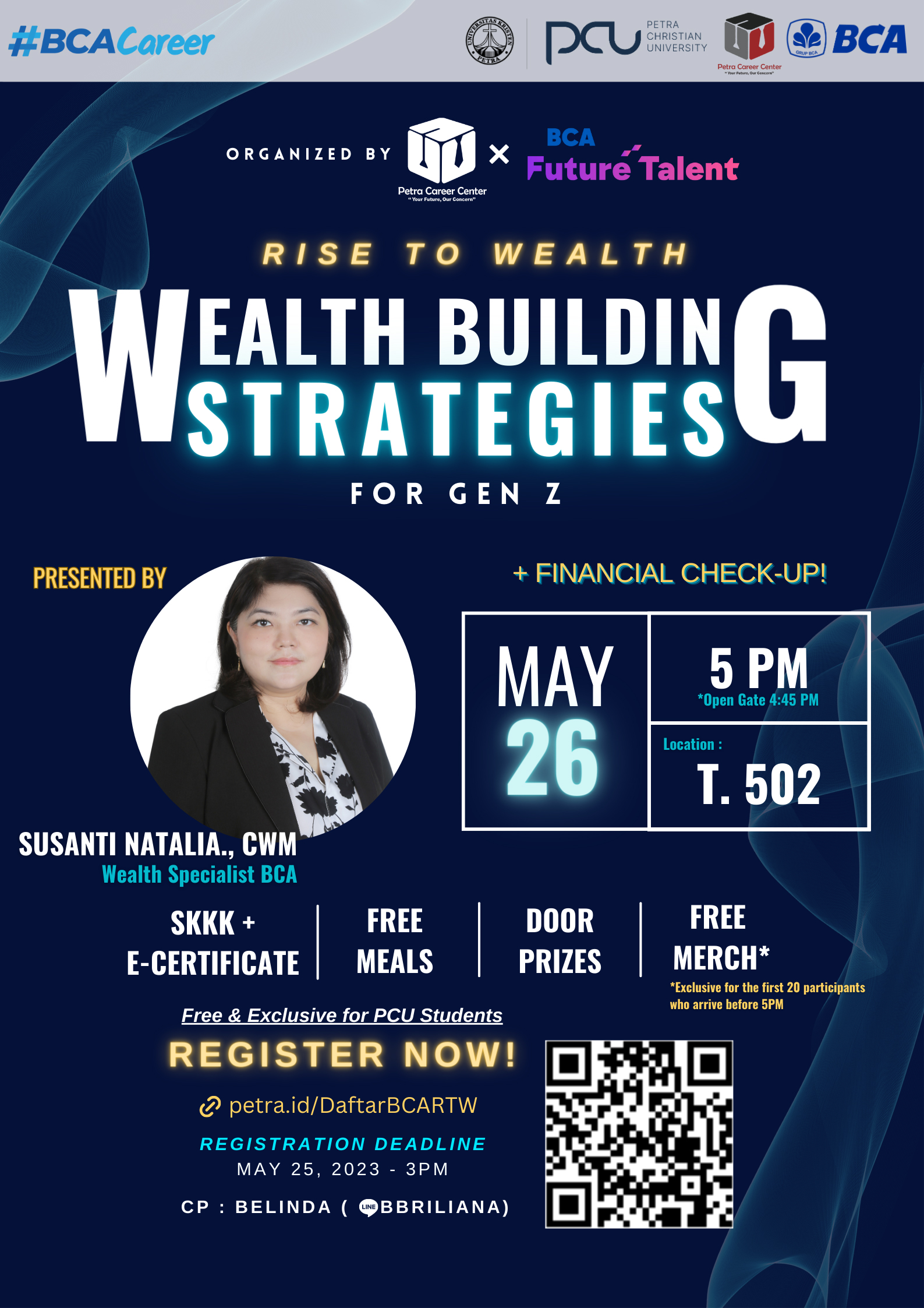 Acara ini mengangkat tema Rise to Wealth: Wealth Building Strategies for Gen Z, dimana acara ini merupakan acara kolaborasi BCA Future Talent dengan Petra Carrer Center. Acara ini diselenggarakan pada 26 Mei 2023 dengan narasumber Susanti Natalia.