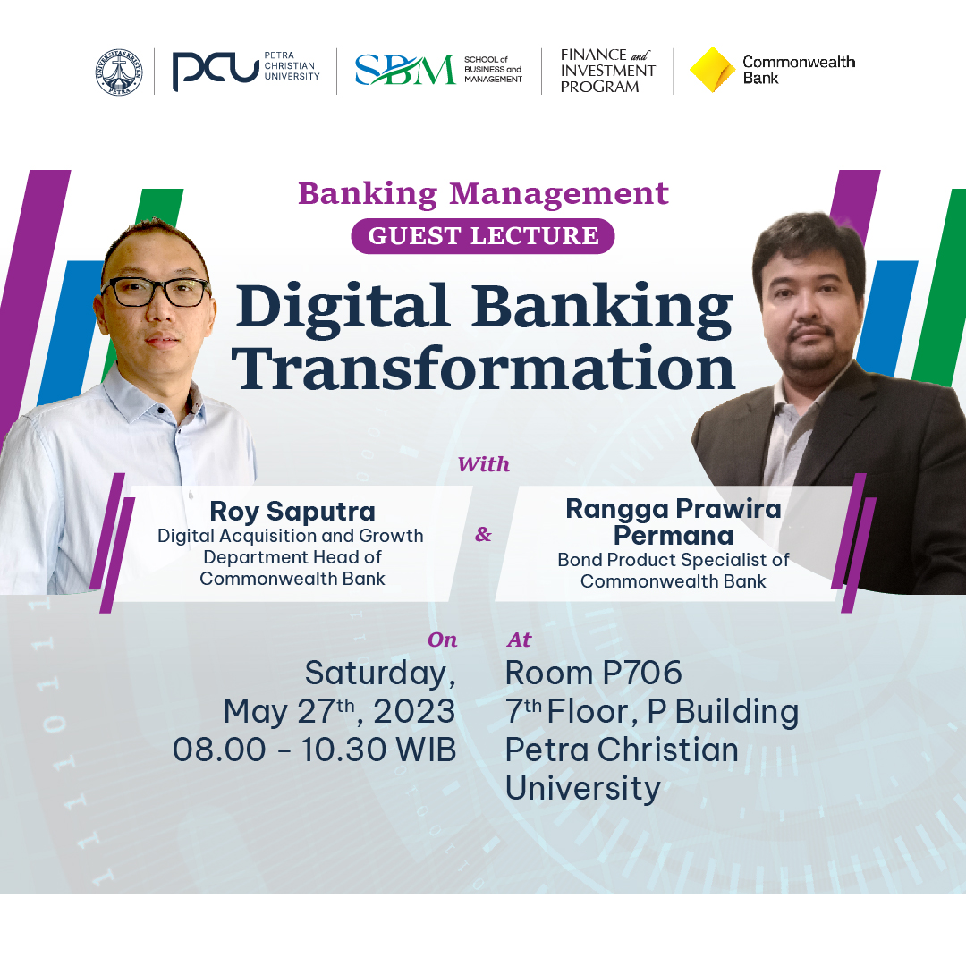 Kuliah Tamu Manajemen Perbankan dengan tema "Digital Banking Transformation", diselenggarakan oleh Program Manajemen Keuangan Universitas Kristen Petra Surabaya pada tanggal 27 Mei 2023 jam 08.00 - 10.30 WIB bertempat di gedung P.706. Dengan menghadirkan Roy Saputra dan Rangga Prawira Permana sebagai narasumber.
