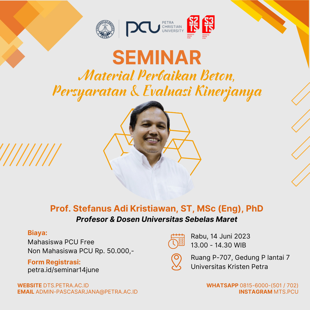 Seminar material perbaikan beton, persyaratan dan evaluasi kinerjanya akan diselenggarakan pada Rabu, 14 Juni 2023 jam 13.00 - 14.30 WIB. Bertempat di Gedung P.707. dengan narasumber Prof. Stefanus Adi Kristiawan.