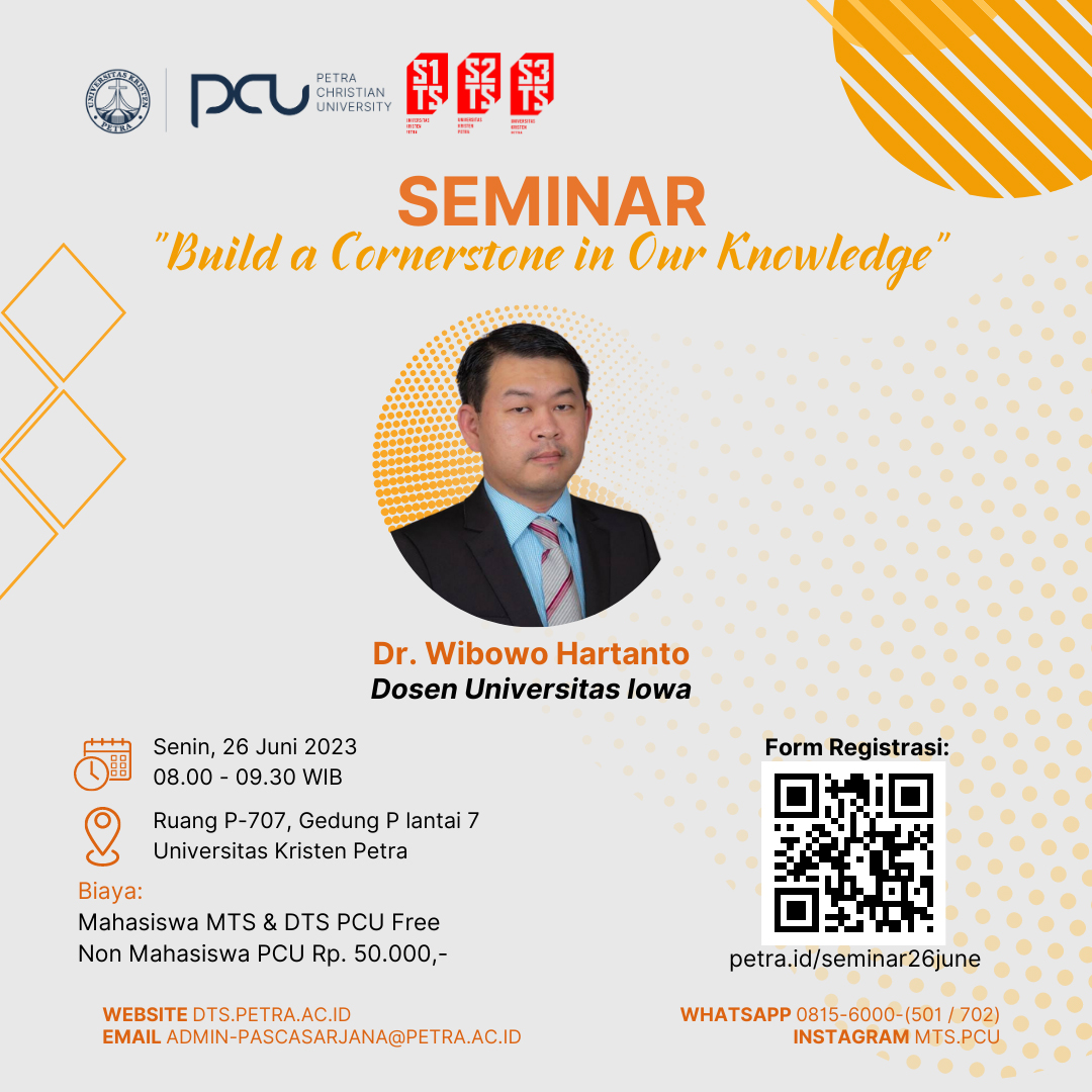 Seminar build a cornerstone in our knowledge akan diselenggarakan Program Studi Doktokral Teknik Sipil UK Petra. Pada Senin, 26 Juni 2023 jam 08.00 - 09.30 WIB di tempat gedung P.707. dengan narasumber Dr. Wibowo Hartanto.
