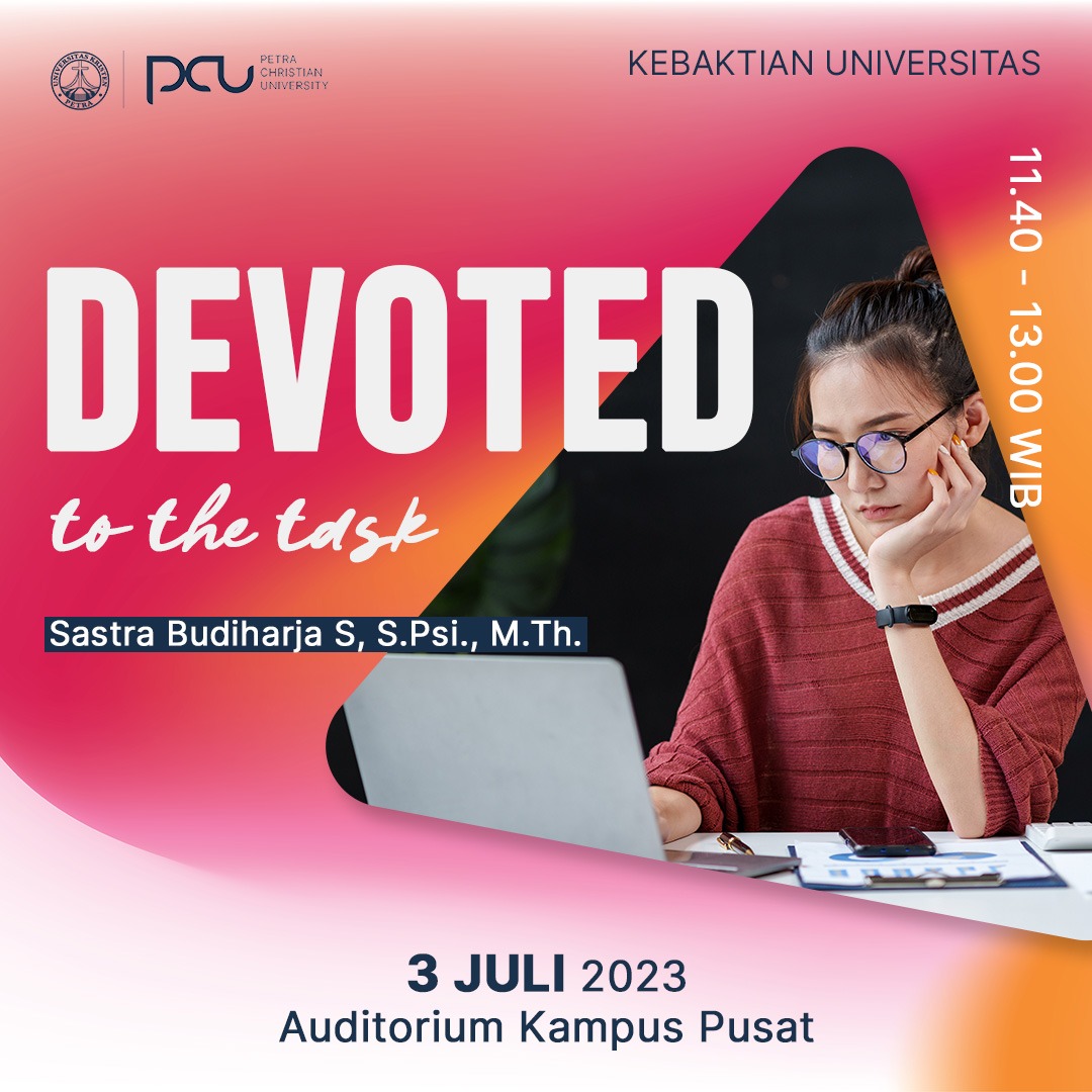 Kebaktian Universitas setiap hari Senin, diadakan pada tanggal 03 Juli 2023 jam 11.40 - 13.00 WIB bertempat di Auditorium kampus pusat Universitas Kristen Petra Surabaya. Pada kebaktian ini mengangkat tema "Devoted to the task" dengan pengkhotbah bapak Sastra Budiharja S., S.Psi., M.Th.