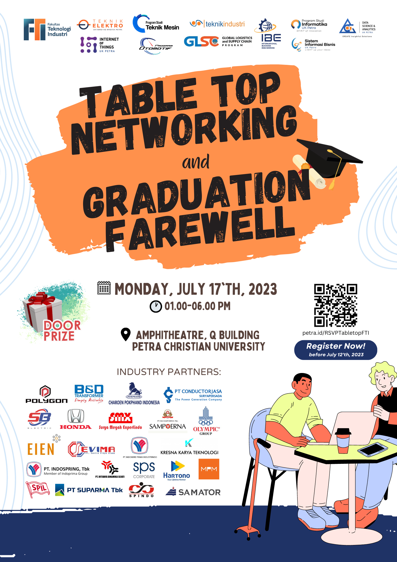 Sedangkan graduation farewell adalah tonggak penting dalam kehidupan siswa dan mewakili transisi ke tahap selanjutnya. Ini berfungsi sebagai momen refleksi, perayaan, dan rasa syukur atas perjalanan pendidikan dan hubungan yang terjalin selama mereka berkuliah. Ini adalah waktu untuk mengucapkan selamat tinggal kepada teman seperjuangan, para dosen, dan lembaga pendidikan yang telah memainkan peran penting dalam pertumbuhan pribadi dan akademik mereka. Secara keseluruhan, perpisahan kelulusan adalah peristiwa sentimental untuk menghargai prestasi lulusan, mengakui kontribusi mereka, dan suatu doa yang mengharapkan lulusan untuk mencapai kesuksesan dalam usaha mereka di masa depan. Acara ini diselenggarakan oleh Fakultas Teknologi Industri pada tanggal 17 Juli 2023 ditempat Amphitheatre Q.