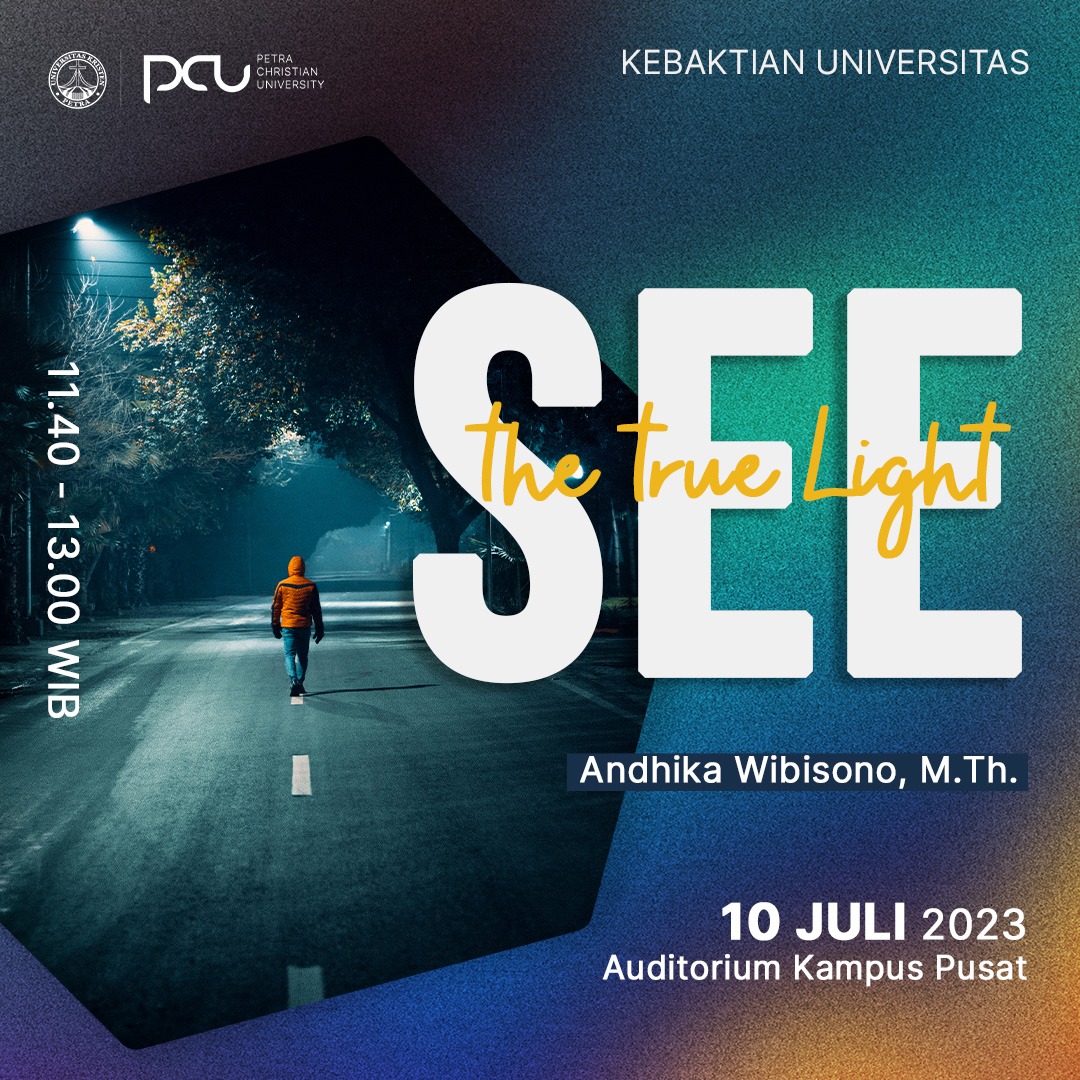 Kebaktian Universitas setiap hari Senin, diadakan pada tanggal 26 Juni 2023 jam 11.40 - 13.00 WIB bertempat di Auditorium kampus pusat Universitas Kristen Petra Surabaya. Pada kebaktian ini mengangkat tema "see the true light" dengan pengkhotbah bapak Andhika Wibisono, M.Th.