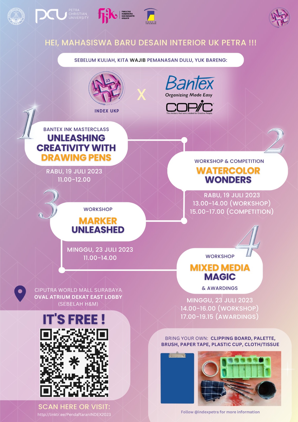 Program Studi Desain Interior UK Petra pada 19-23 Juli 2023 mengadakan serangkaian acara yang bernama INDEX 2023. Ada kompetisi dan workshop. Acara ini bertempat di Ciputra World Mall Surabaya