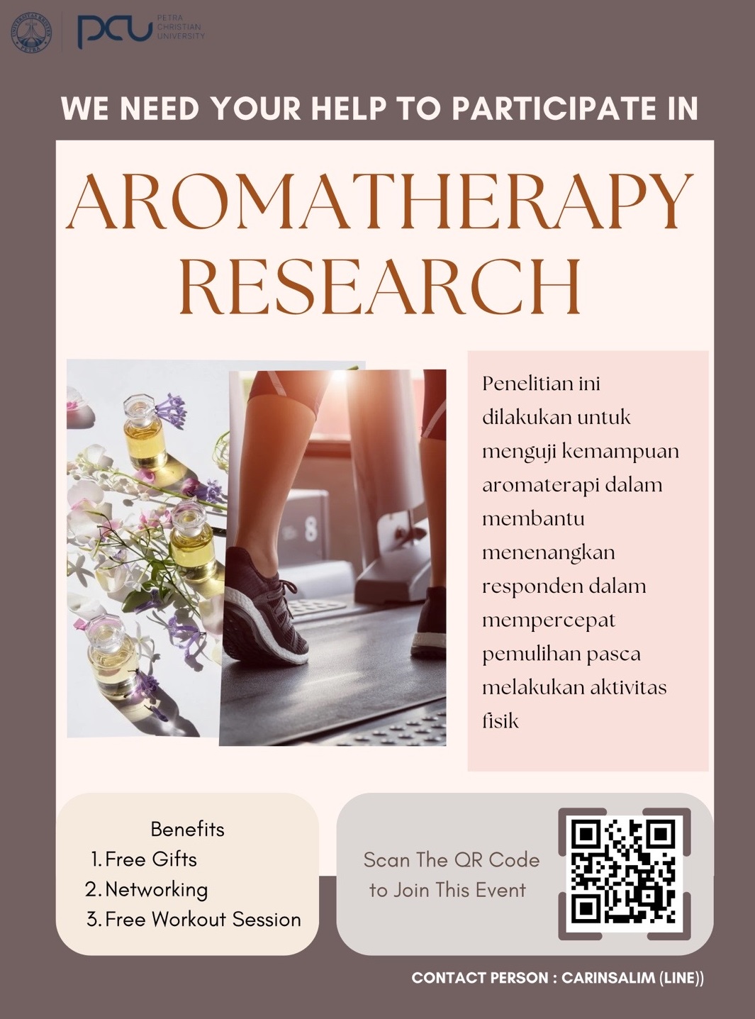 Aromatherapy Research merupakan sebuah penelitian untuk mata kuliah metodologi penelitian yang bertujuan untuk mencari tahu kemampuan aromaterapi dalam mempercepat pemulihan pasca aktivitas fisik.