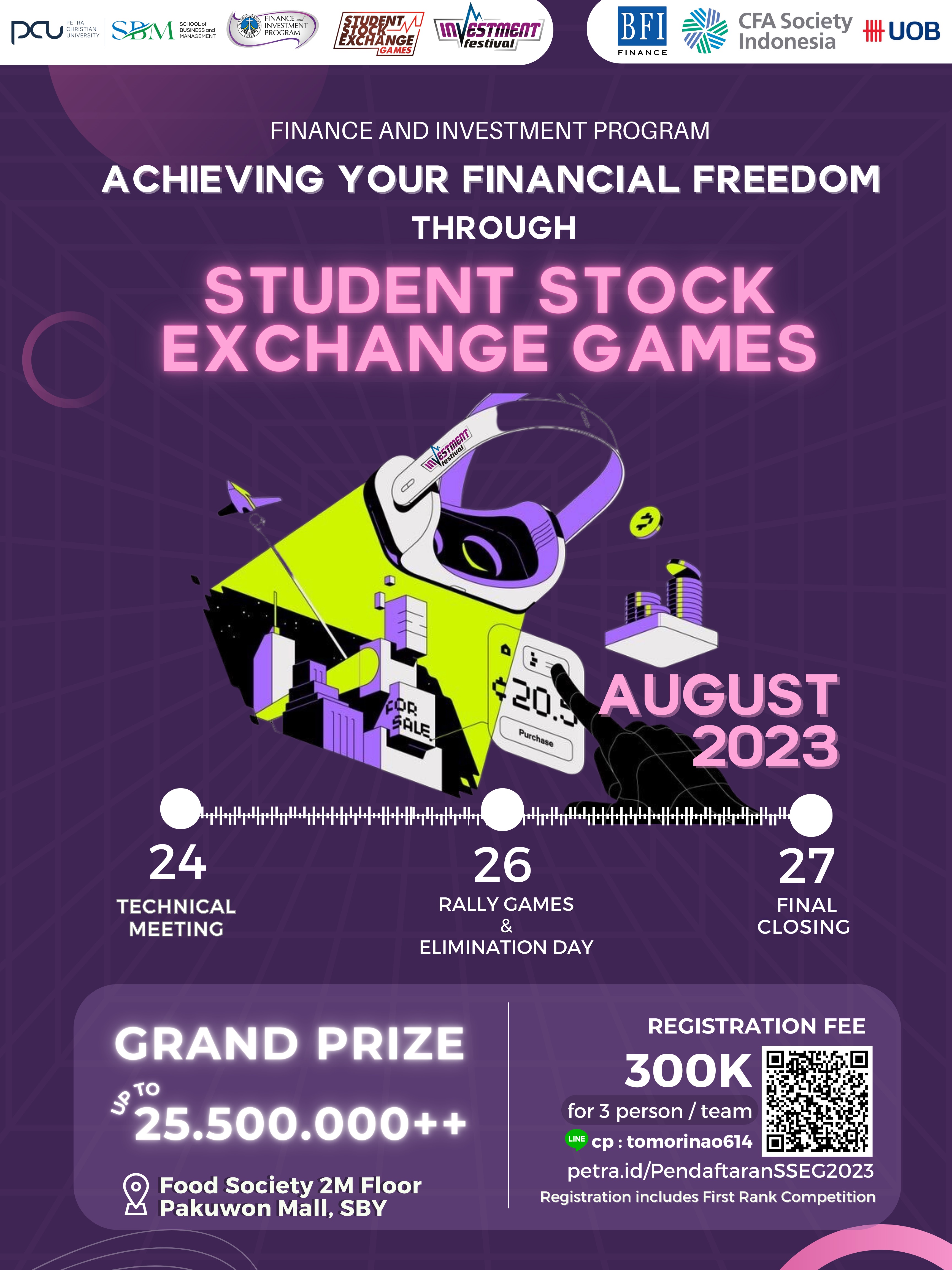 SSEG (Student Stock Exchange Games) adalah lomba simulasi pasar modal dimana peserta bisa merasakan situasi riil bertransaksi di pasar modal. Acara akan dilakukan di Food Society Pakuwon Mall dengan hadiah up to 25.500.000. Pendaftaran secara berkelompok dengan anggota 3 orang (biaya ada di poster). Khusus peserta SSEG, yang tidak lolos penyisihan bisa mengikuti lomba First Rank tanpa tambahan biaya apapun.