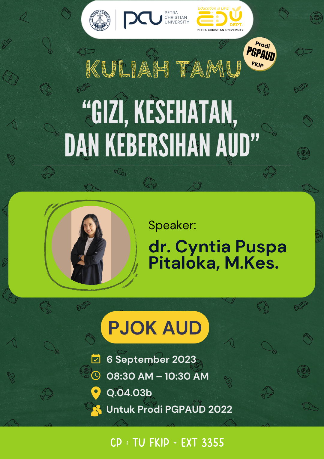 Kelas PJOK mengadakan kuliah tamu yang bertemakan "Gizi, kesehatan dan kebersihan AUD". Dibawakan oleh dr. Cyntia Puspa Pitaloka, M.Kes. Kuliah tamu ini diselenggarakan pada 06 September 2023.