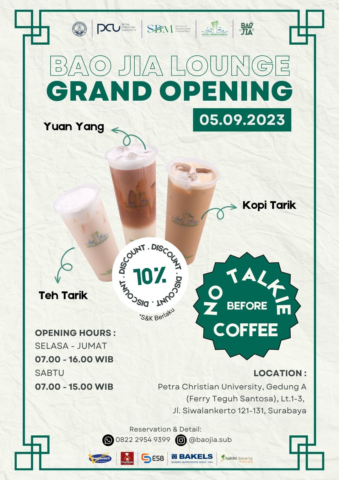 Grand opening Bao Jia Lounge telah dibuka oleh Program Manajemen Perhotelan Universitas Kristen Petra Surabaya.