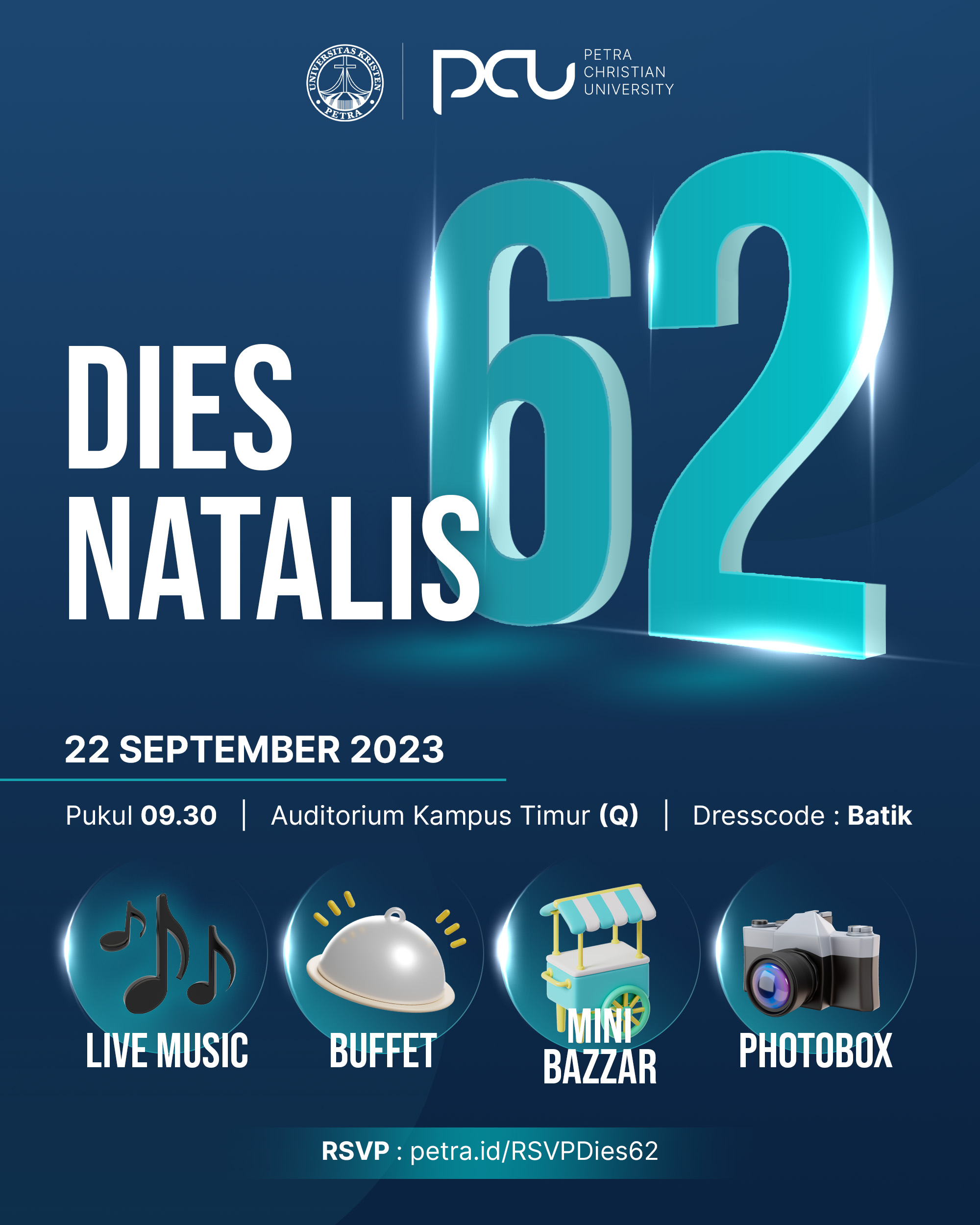 Dies Natalis Universitas Kristen Petra Surabaya yang ke-62, akan diselenggarakan pada tanggal 22 September 2023 bertempat di Auditorium gedung Q. Jam 09.30 WIB