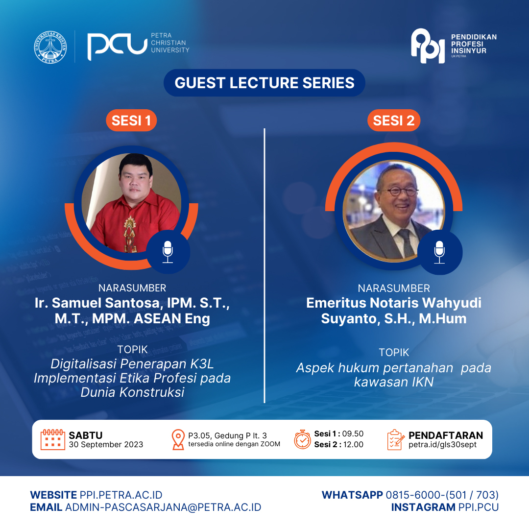 Pada tanggal 30 September 2023 Program Pendidikan Profesi Insinyur UK Petra Surabaya, mengadakan kuliah tamu dengan narasumber Ir. Samuel Santosa M.T. dan Emeritus Notaris Wahyudi Susanto, S.H., M.Hum. Acara ini juga bisa diikuti secara offline dan online.