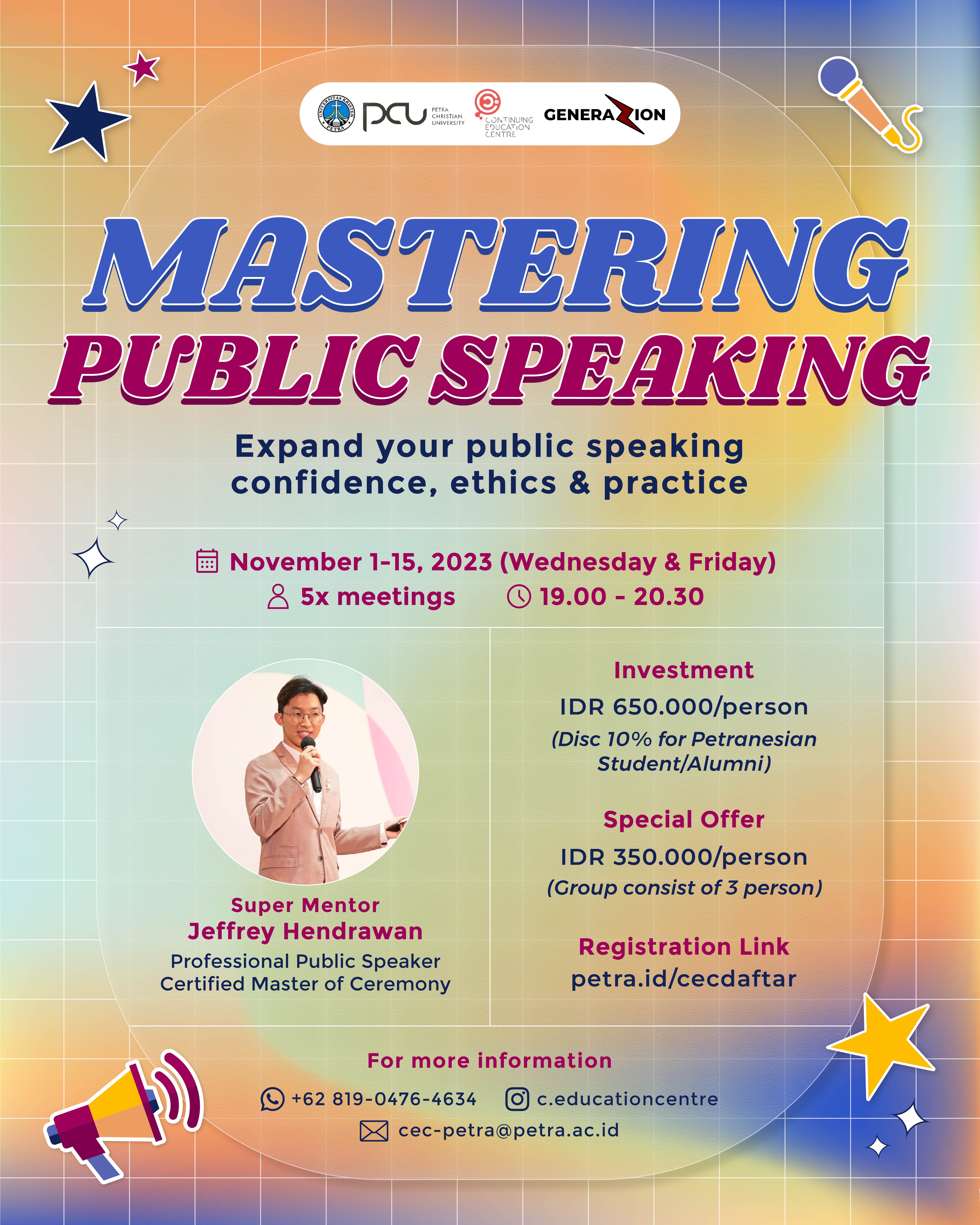Program Pendidikan Berkelanjutan Universitas Kristen Petra Surabaya, membuka kelas khusus "Mastering Public Speaking". Kelas ini dilaksanakan pada 1-15 November 2023 sebanyak 5 kali pertemuan.