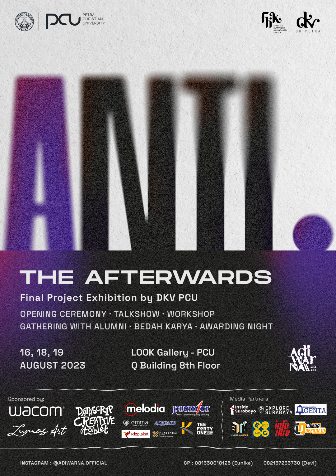 Adiwarna merupakan acara pameran tugas akhir yang diadakan setiap tahunnya oleh Program Studi DKV dan IPDM Universitas Kristen Petra. Rangkaian acara Adiwarna 2023 meliputi Pameran Karya Tugas Akhir, Talkshow, Workshop dan Gathering (Sharing) Alumni. Rangkaian acara ini diselenggarakan pada 16, 18, 19 Agustus 2023 bertempat di Gedung Q lantai 8.
