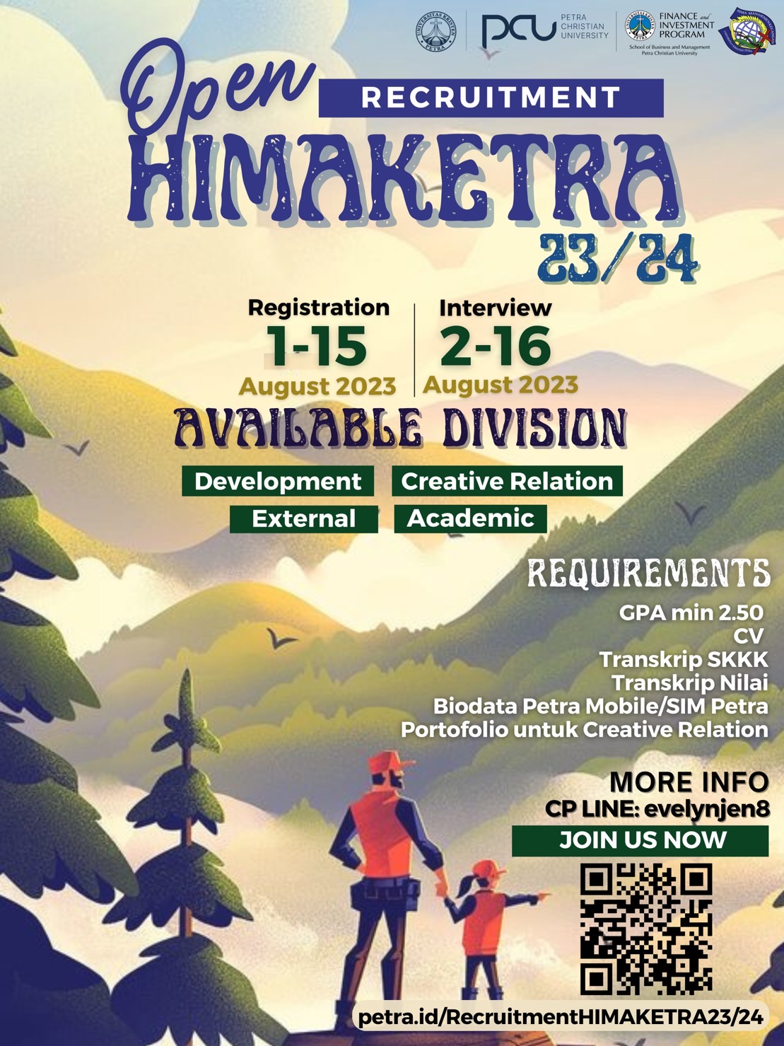 Program Manajemen Keuangan UK Petra membuka kesempatan bagi mahasiswa Program Manajemen Keuangan untuk bergabung dalam fungsionaris Himpunan Mahasiswa (HIMAKETRA). Info selengkapnya bisa dilihat di petra.id/RecruitmentHIMSAKETRA23/24.