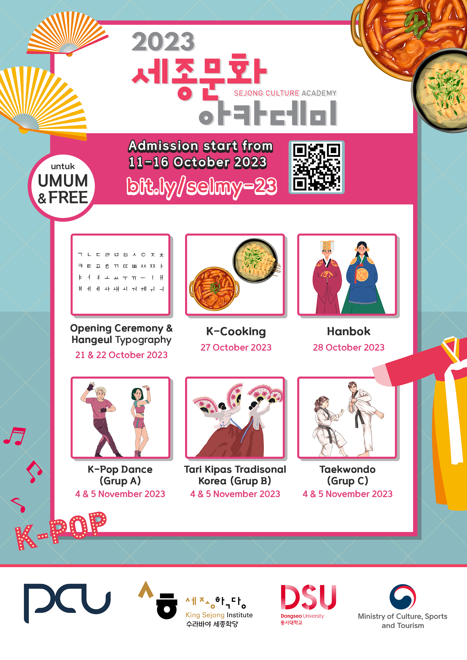 Hangeul Typography, K-Cooking, Hanbok, K-Pop Dance (Grup A) Tari Kipas Tradisional Korea (Grup B), Taekwondo (Grup C)